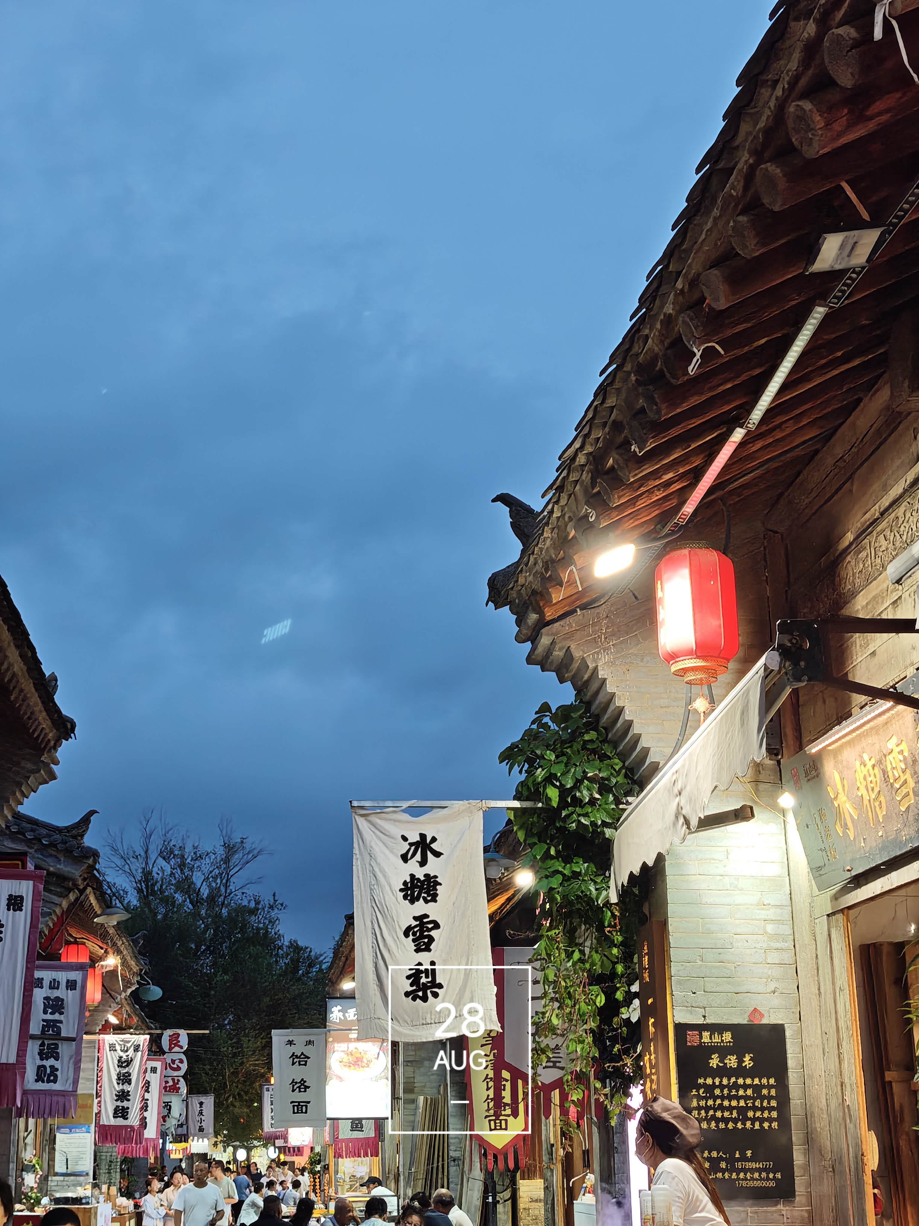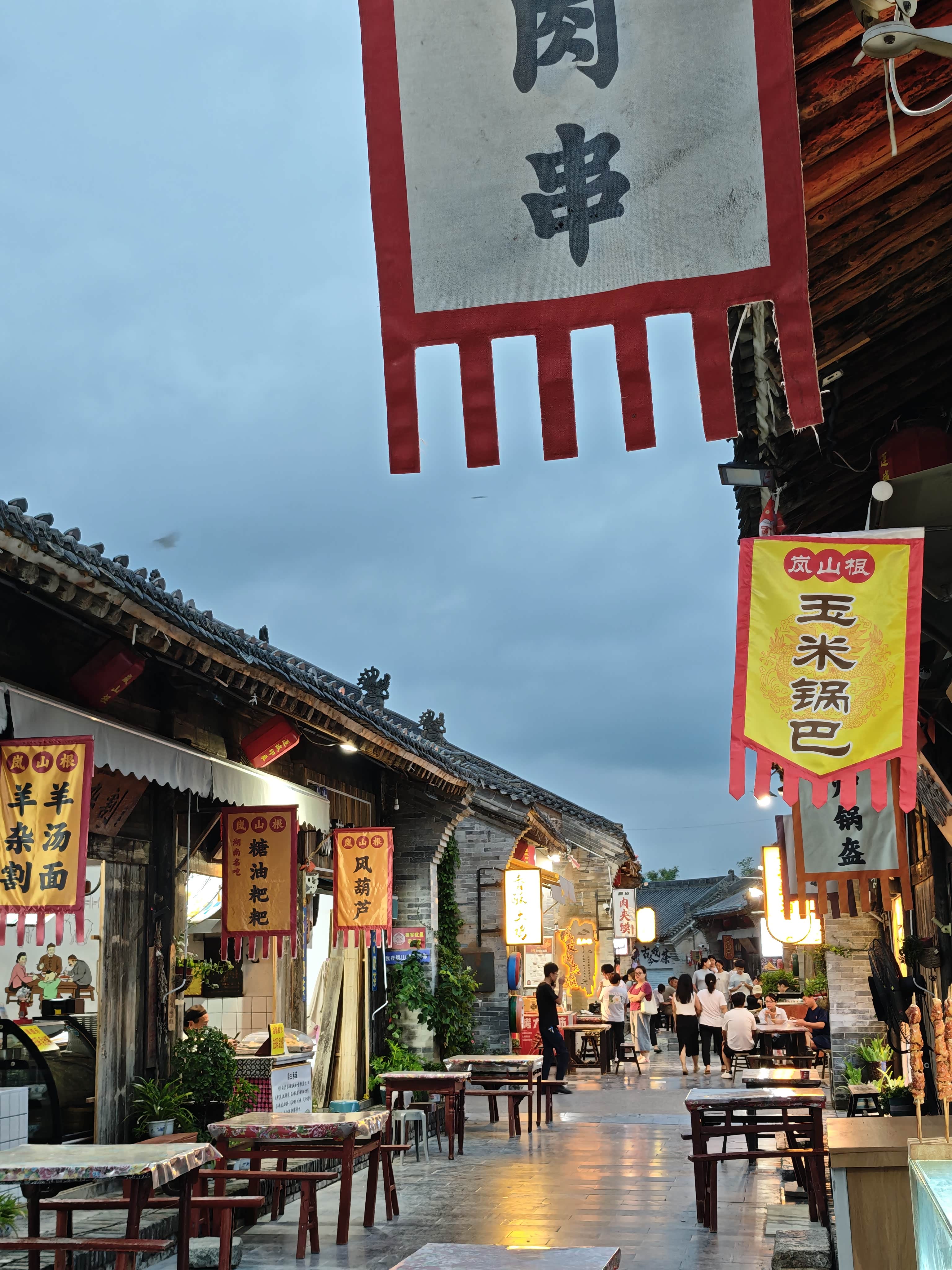 街道正中央,一串串红灯笼低低挂着,把石板路映得通明。桌椅早已摆满路边,有人捧着热气腾腾的碗吃羊杂割,有人举着竹签串起的肉串大快朵颐,连空气里都飘着糖油粑粑的甜香与锅盔的焦香。商户的吆喝声、食客的谈笑声、碗筷碰撞的清脆声,混成一首最鲜活的“人间烟火交响乐”。