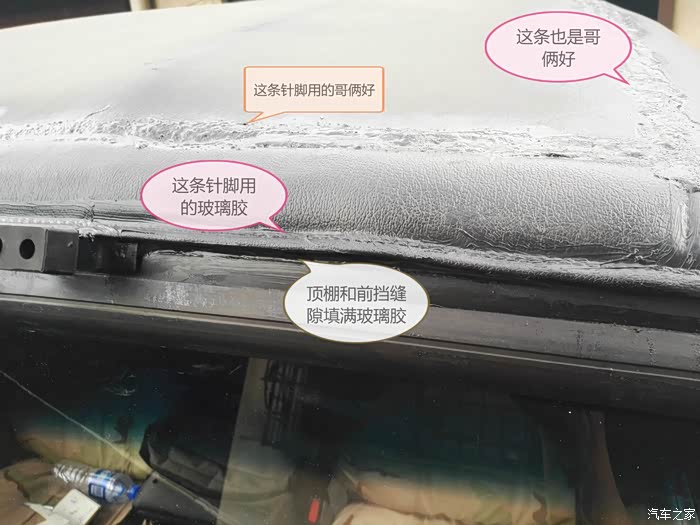 还是小瞧玻璃胶的特性了,打两遍是最好的,第一遍打上去,比较糙,提枪有拉丝,指头是抹不平的,第一遍干了之后,再打稍微薄的一层,抹平,就妥了。我就有点和这胶较劲了,第一遍就想着既堵了漏,又美观,欲速则不达。看着活儿糙的,好在洗了两回车,淋了两场雨,不漏,也就安心了。