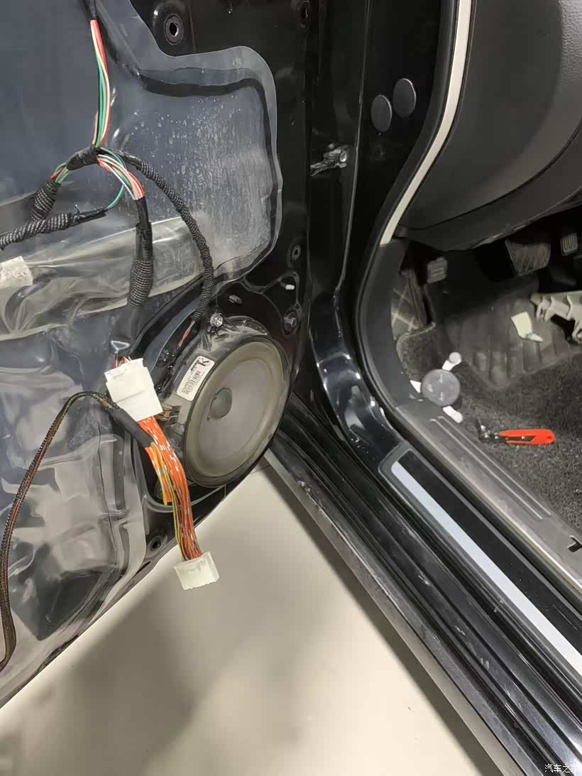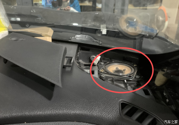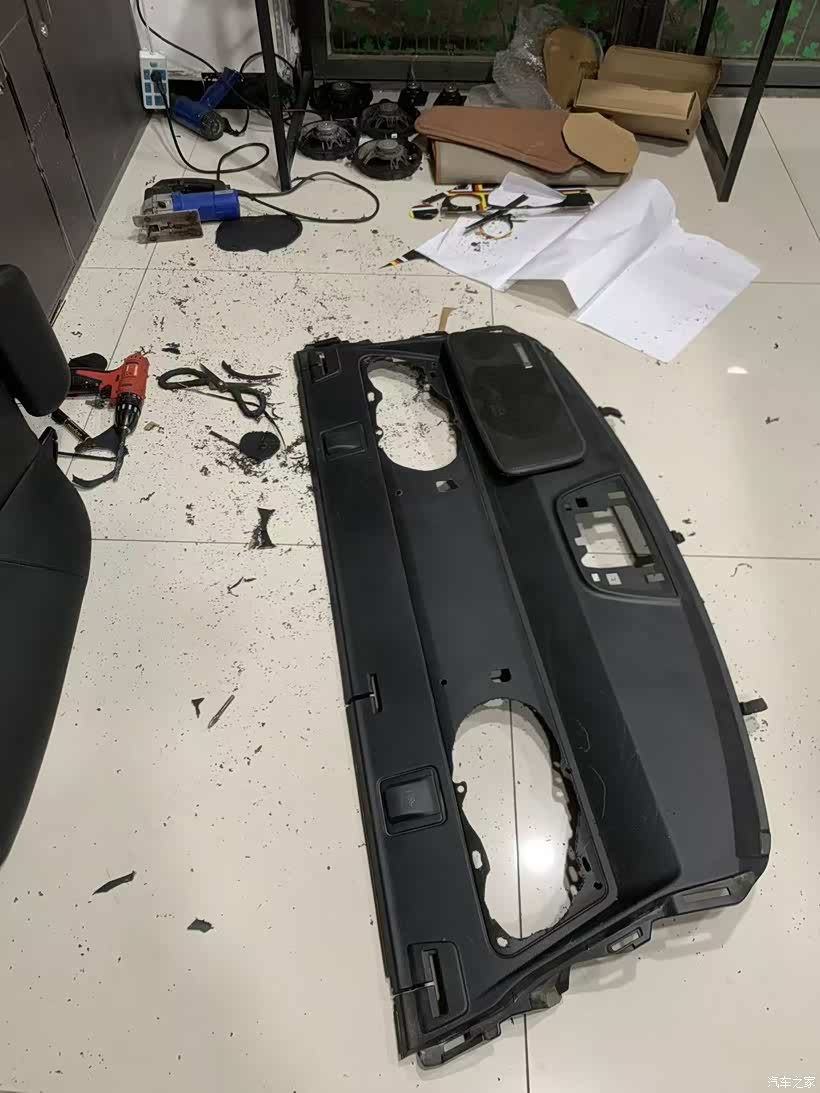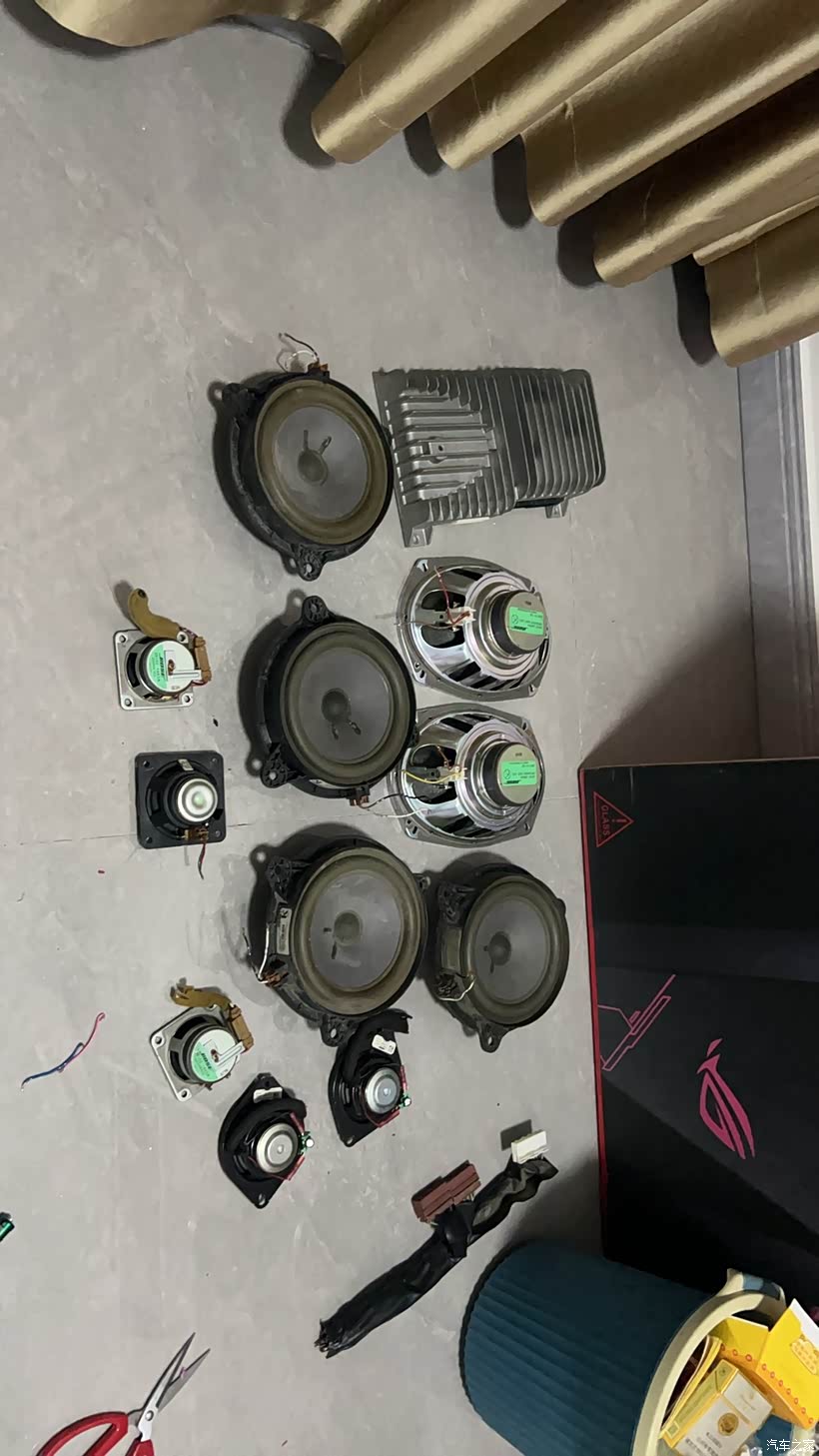 改装第一步是拆卸原车部件,从车门内饰板、中控台饰板到后平台盖板,师傅用塑料撬棒沿卡扣位慢慢撬动,避免硬掰造成划痕(图中能看到拆下来的后平台饰板,原车高音的喇叭位尺寸偏大,后续要为BOSE喇叭重新做个模具垫上)。原车喇叭拆下来后对比公爵BOSE喇叭,磁钢大小、振膜材质的差距肉眼可见,这也是原车音质拉胯的核心原因。