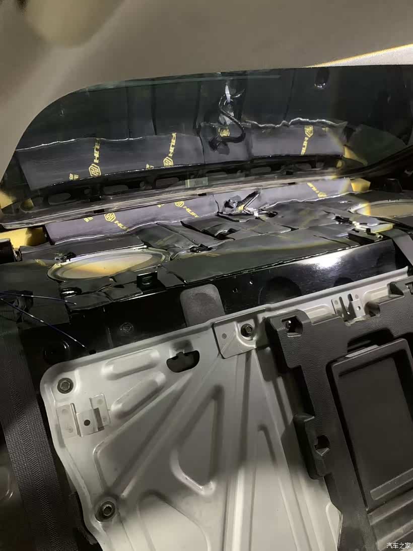 音响改装,隔音先行!这步绝对不能省,否则喇叭发声时车门会共振产生杂音。后平台做了内层止震板+外层隔音棉的双层处理,实拍图里后备箱的隔音层平整服帖)。做完隔音后,关门声从“哐哐”变成沉稳的“嘭”声,路噪和风噪也降低了不少,更重要的是为喇叭提供了扎实的发声环境。