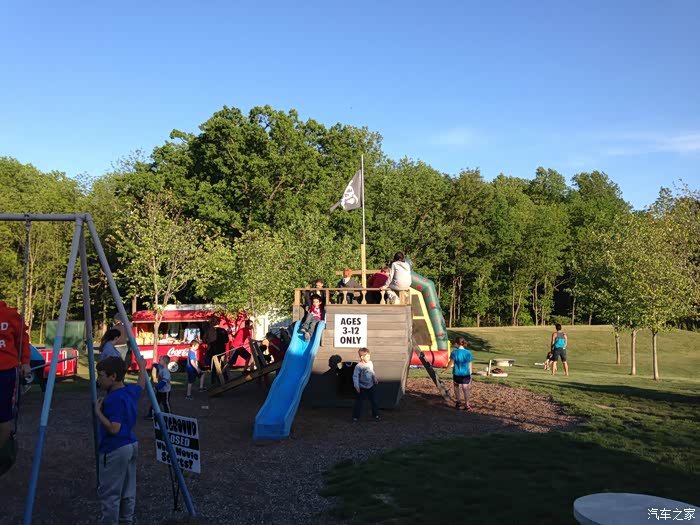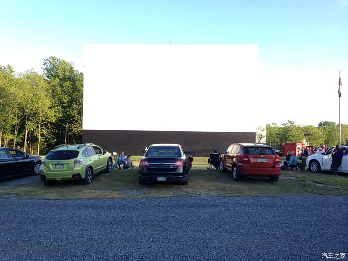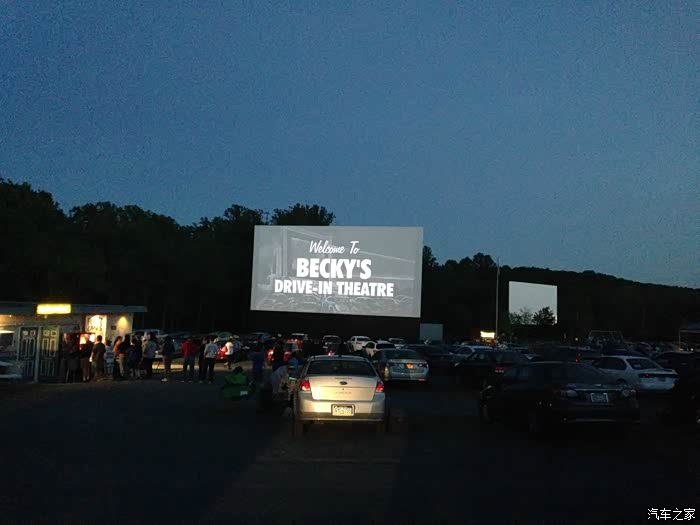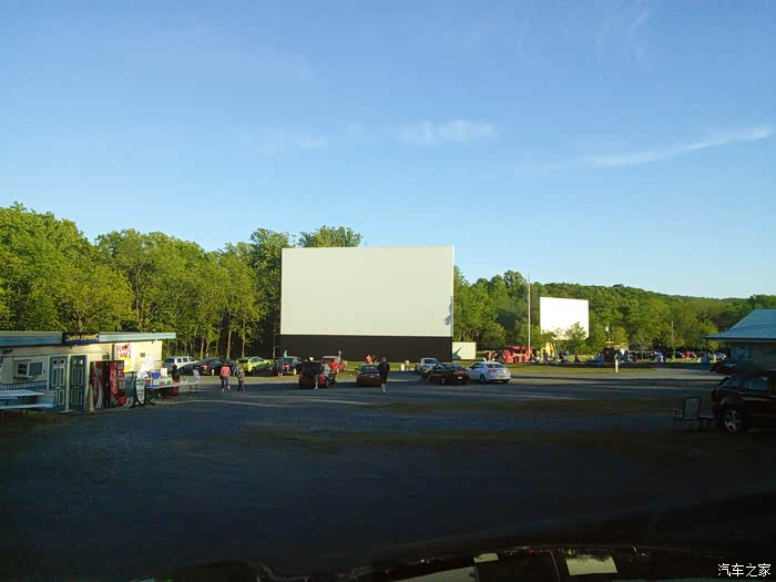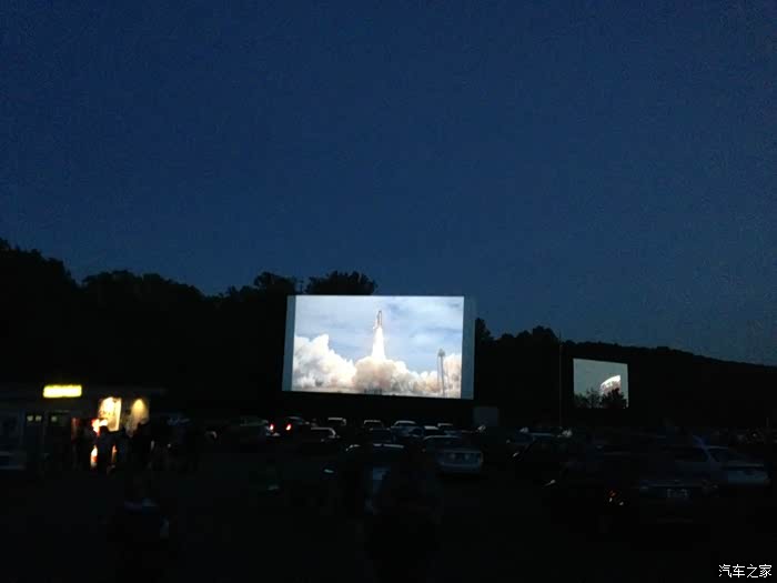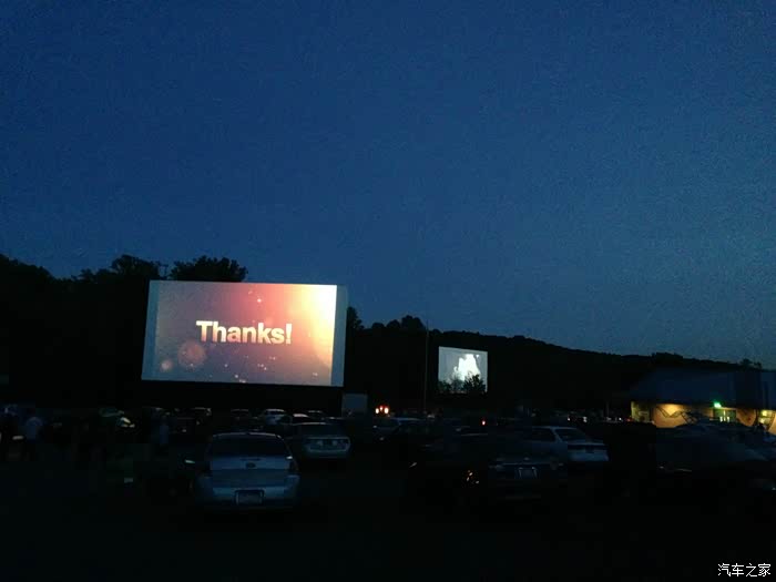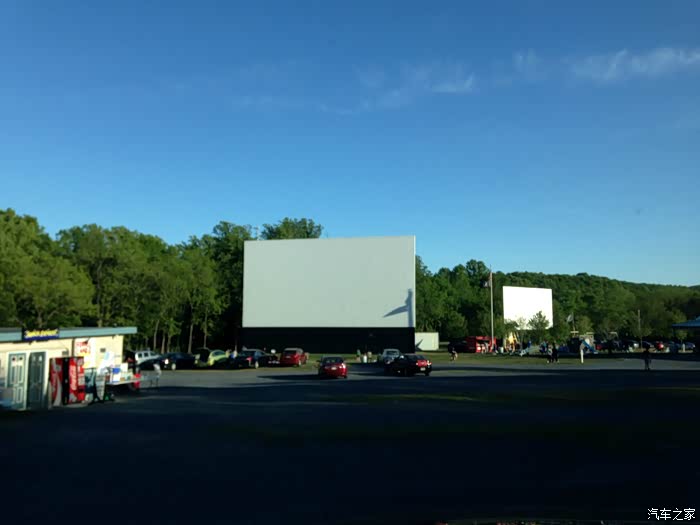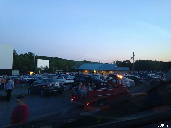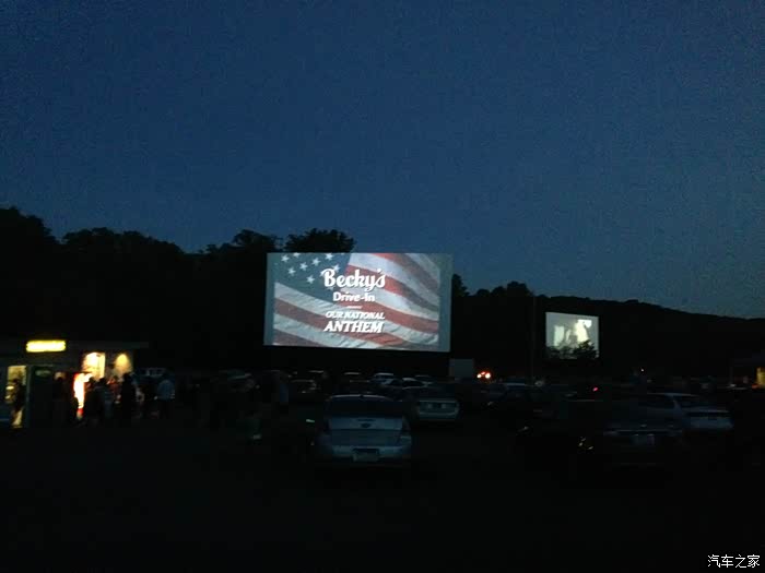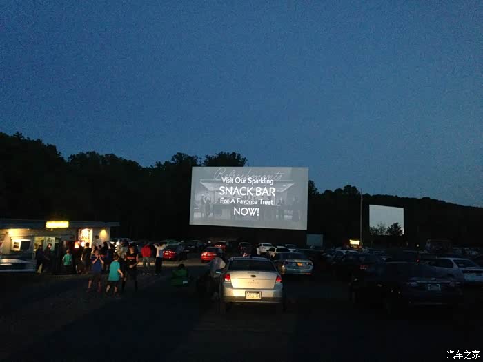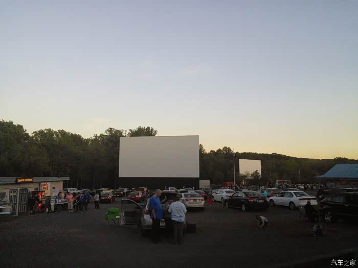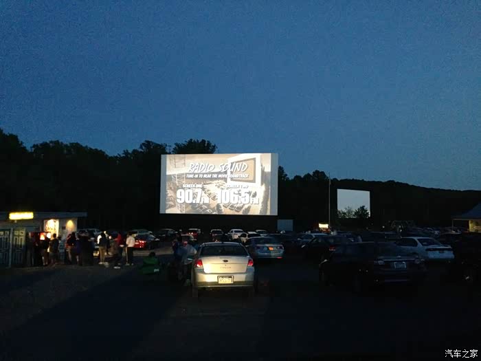 看电影的流程是从一般傍晚开始售票入场,入口处按人头买票,开车进场,这边票价是成人9美元一个人,儿童6美元。比起普通电影院,十几美元的票价,这露天汽车影院还是比较实惠的,而且放的片子也是最新影院同步上映的大片。进场后有人指挥停车,小车靠前,大车靠后,头朝前还是屁股朝前自己定。这时候一般是五六点钟,距离太阳落山还早,大家在车前支上躺椅,要么聊天要么吃东西,放小孩子去玩。这家影院并不禁止外带的食物,不过为了照顾他们生意,很多人还是在影院里买东西吃的,美国电影院的东西也不会贵的离谱。等太阳落山,大家回到车里或者车前,打开收音机,调到电影院的音频,就可以开始看电影啦,怕把车电池耗尽,所以一般都会自带收音机。其实从银幕亮起来,到真正开放,还是有一段时间的,会放很多汽车影院特色的广告,催人们快去买饮料,零食。这一次的票价是看两场电影的,从太阳落山看到半夜,两块屏幕内容不一样,又是两场,所以两块屏幕一晚上会放四部电影,中场时候想换电影看的观众可以把车开到另一块场地去。等到看完第二部,已经是后半夜了,之后就散场了,大家开车回去。