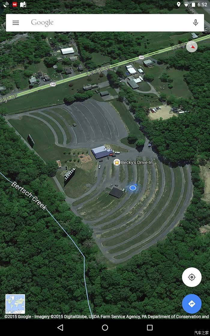 我和女朋友一起去的是美国宾夕法尼亚州的一个汽车影院,这东西因为占地大,一般都是在乡下,或者城市周边。我去的这家叫Becky‘s Drive-in, 从下面的卫星图可以看到,这里是有两块银幕的,每块银幕前面各有一片扇形场地是用来给观众停车的,场地有些坡度,后排高,前排低,便于停车观看。