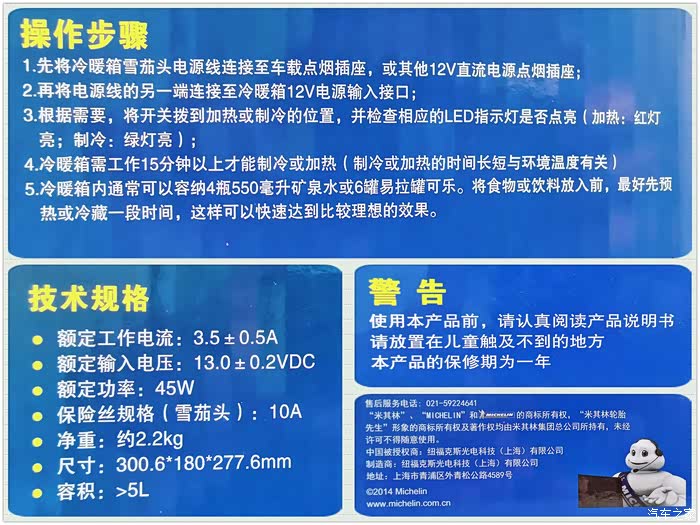米其林是法国的轮胎生产商,1889年创立,早期生产单车轮胎,其后才开始生产汽车轮胎,国际知名品牌。旗下公司还涉足汽车相关产品的生产,其中包括充气泵,脚踏打气筒、电子胎压计、汽车脚垫、雨刷、车载逆变器、冷暖箱等。我也用过不少该品牌的产品,其独特的性能给我带来了很好的使用体验。此次试用评测后,虽有可改进的不足之处,这款冷暖箱整体上表现还是可以的。
