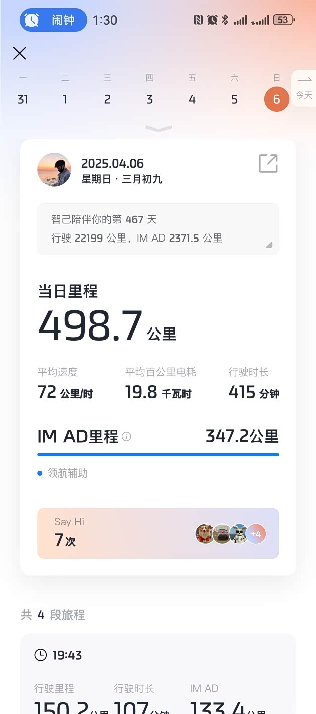 上周末趁着清明假期最后一天,去了附近不太远的明水古城,全程来回将近500公里,满电出发,几乎是全程高速。上了高速打开智驾,智驾全程130的速度跑,天气不是很热,空调为自动。先来聊聊智驾的表现,全程高速智驾,除了进收费站会退出智驾之外,其他所有的路程表现优秀,高速上车辆挺多,智驾130的速度可以在车流中来回超车,丝滑程度还是不错的,车距我是设置的最近的车距,大概还有个100~200米。上下匝道以及过弯都可以保持车辆在中间。