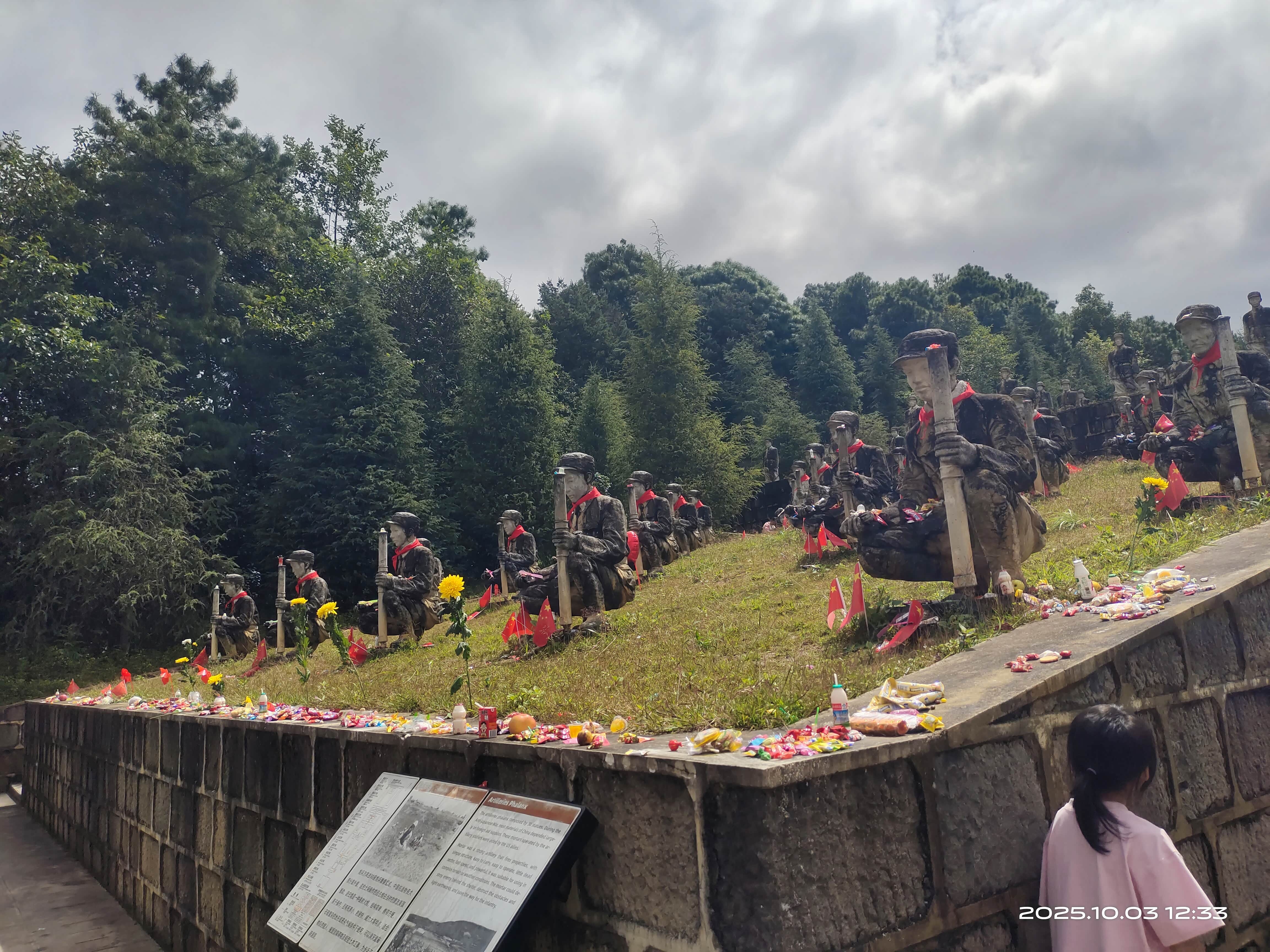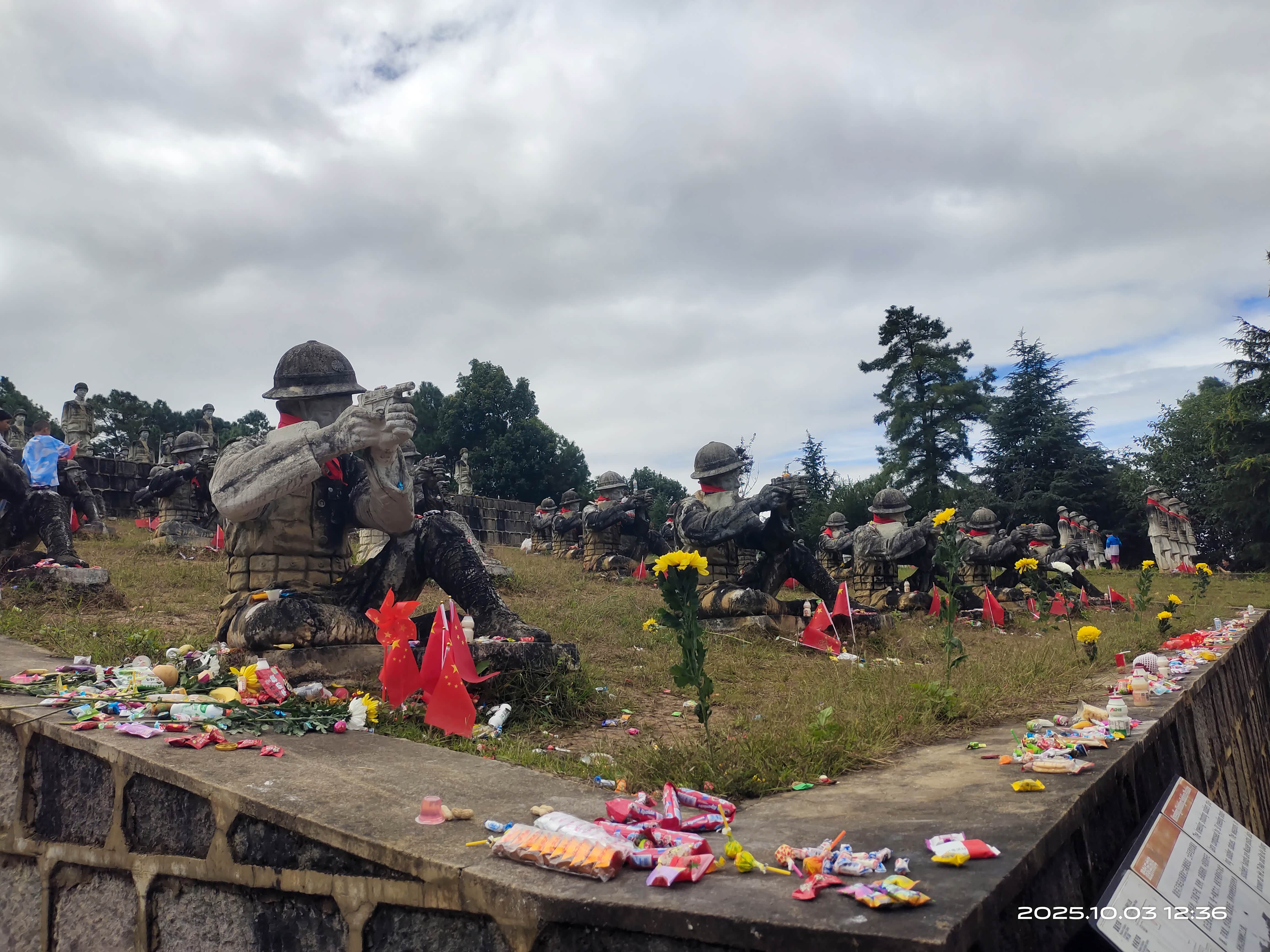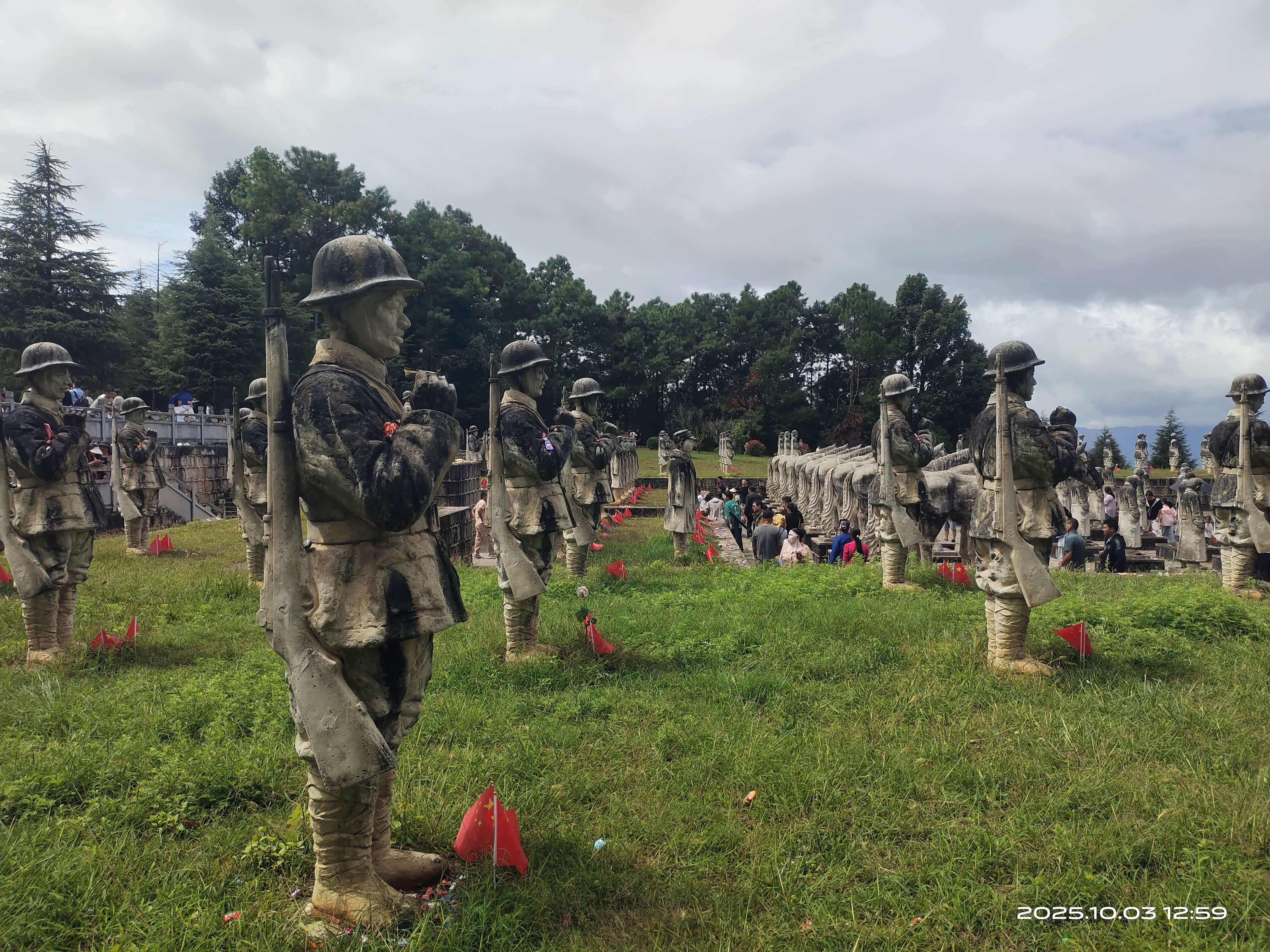 很多人说难怀孩子的人,如果想要孩子可以去娃娃兵方阵里面念叨一下,很可能回去就怀上了,这个准不准不得而知。迷信的角度,确实值得试试。如果能有先辈们的魂魄投胎过来,还真是一件美好的事情呢。我们去之前也想了一下,抗战时候的生活艰苦,娃娃们都没吃过糖,所以去之前特意去超市买了一堆糖果,摆放到娃娃兵雕塑前面,到底能不能吃到另说,心意表达一下。此外,松山海拔高一些,十月的天气有些凉了,去的时候备上一件薄外衣。时不时也下雨,所以雨伞也得准备一把。