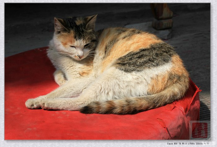 哈哈可爱的猫咪睡在寺庙的蒲团上,云南的天气真的是适合发呆打盹,可这货也忒会找地方了,这要多少香客给他上香磕头作揖呀,摸摸它还喵喵叫闭着眼挠我一把哼哼,怪我打扰它清梦了:))