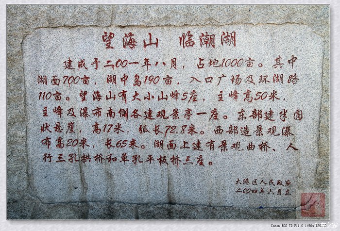 临潮湖坐落于大港地区的北部,是大港区政府在二十世纪九十年代来规划挖湖造山而形成。望海山、临潮湖位于大港区北环路北侧,总占地面积1000亩,湖面积700亩,湖中岛占地190亩。 山体面积126246平方米,高度50米,装饰有悬崖和瀑布,种植怪石5万多平方米,绿化面积12.6万平方米。湖上有两座跨湖大桥和一座观景曲桥。山顶和湖心有观景亭。 在软基地上堆山工程尚属全国首例。临潮湖位于大港高教生态园区内,东与天津外国语大学仅相邻,西与南大滨海学院相接,北与天津医科大学临床学院为伴,周边还国家法官学院等一批院校。