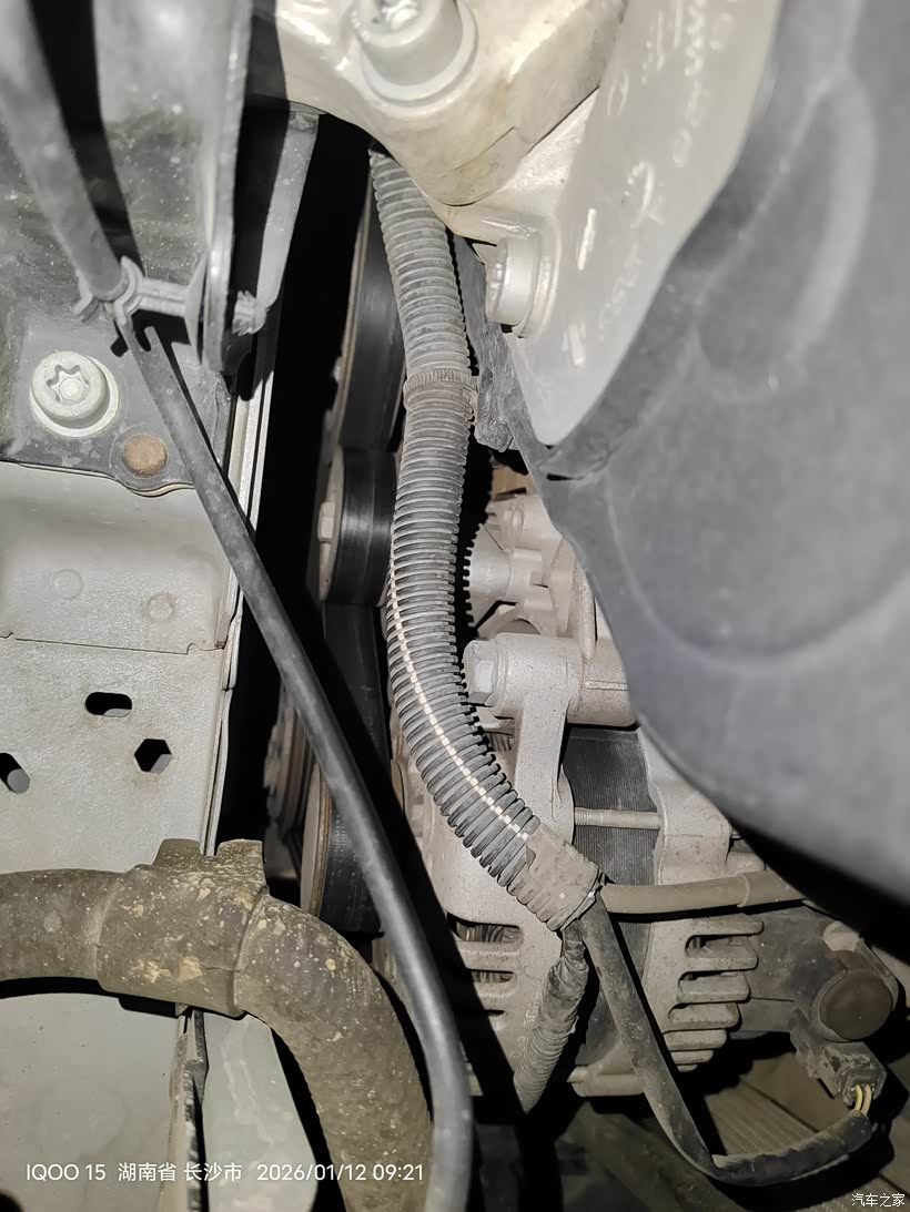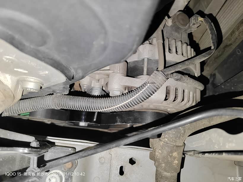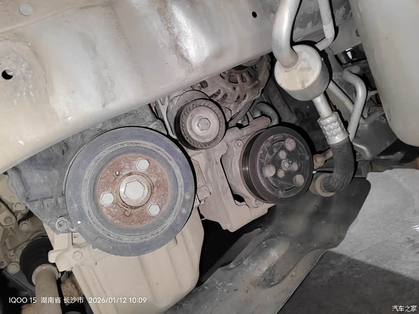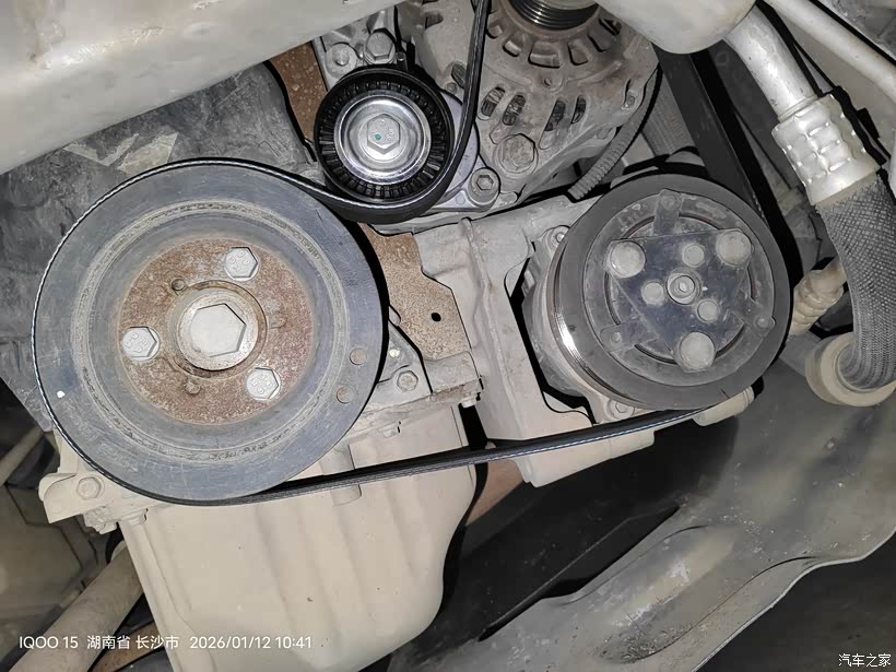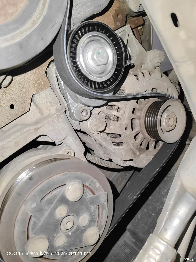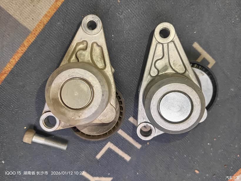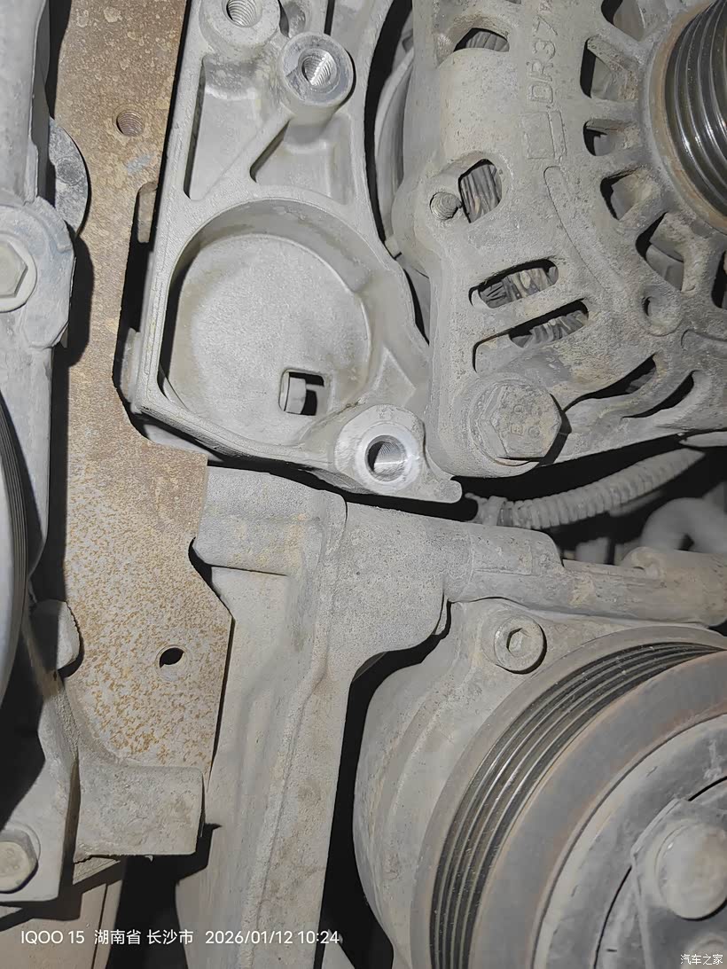用上加力杆后还是不能插上涨紧轮限位销子,皮带已经被我拿掉了,涨紧轮已经回弹到底,挡住内六角螺丝。所以只能从下面拆了