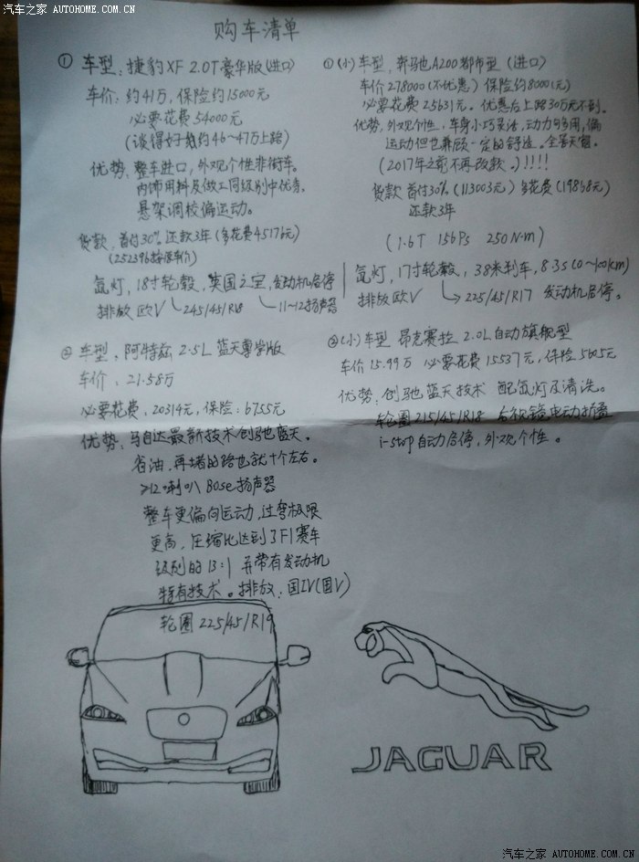 2、捷豹XF 2015款 豪华版 车价差不多能谈到41.5万(原价61万)(32个点),相比于14款(40.5万)多了倒车影像(原厂加装10000+),方向盘加热,前排座椅加热,感觉都是比较实用的配置(这是纠结的最久的一款车)其实至今都还是非常喜欢它的,首先外观就不用说了,绝对拉风,捷豹的日间行车灯也绝对是亮点,样式很是犀利,人见人爱,然后就是启动时的旋钮式档杆自动上升,空调出风口自动打开,中控台全真皮包裹,同级别车型的做工真心没法比。问了下颜色,白色有现车,鱼子酱色需预定。当然也试驾了,1.8吨的车重真的很稳,240的最大马力也够用,车上的音响绝对是我听过有史以来最好的(试驾车为风华版,没有英国之宝,功率为250W)虽然不是英国之宝,但是也已经很震撼了,想到自家看中的是豪华型(功率为380W的英国之宝,想必效果肯定更出色)作为一名一上车就必须听歌和开天窗的发烧友当时就决定非捷豹莫属了。当天试驾完回家,晚上那个叫睡不着,日思夜想的就要买它,设置把电脑桌面壁纸手机的所有壁纸都换成了XF。怎么看怎么舒服。有些车友可能会问这车保养维修是不是特别贵呀?(这个个人认为捷豹现在在中国的销量是逐年增加的,现在已经对中国市场做出的加大供应量的调整了(比如一万多个配件平均降幅百分之20)