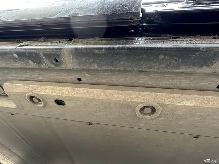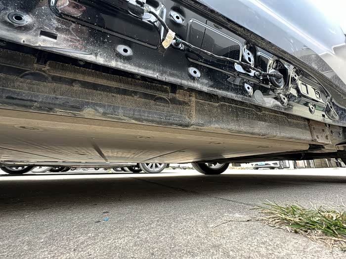 我继续从侧裙这个位置往底盘看过去,我看到了一块非常厚的电池护板,大概有2cm厚的一个大钢板,很结实牢靠的样子,相信能起到很好保护电池的作用。极氪001的电池防护也是经过了车友的“验证”,去年有一辆001事故时底盘的电池硬刚水泥墙,最后也没有引起电池热失控,可见防护之周到。