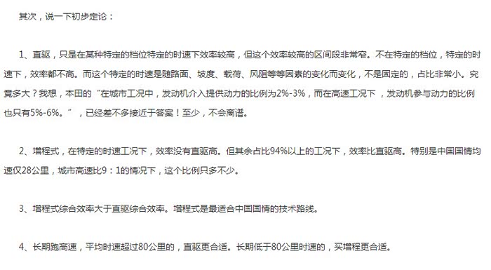 目前,我们需要做的。就是要从多发电这个维度出发,如何让相同的油,发更多的电!谁掌控了这个技术,谁就站上了增程式的头部!当然,电池越大,能量密度越高,对发电的需求越小。但从国家的政策调整看(从全面电动化转变为电驱混动化,而且历史周期明显放长),增程式混动的发展不可限量!它将最先淘汰传统燃油直驱,并和纯电动长期并存!