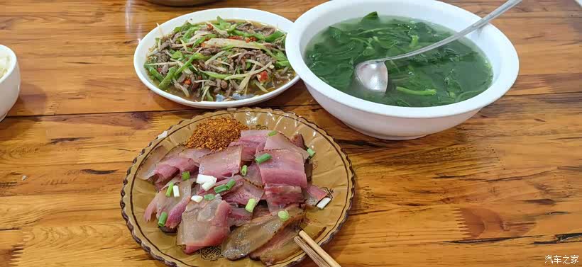 中午时分,肚子开始咕咕作响,我便启程返程,特意避开了高速,选择了风景更美的老国道。老国道两旁绿树成荫,风光秀丽宜人。行至锦屏马草坪时,来到每次路过都会来的小店,选了一个靠窗的位置坐下,点了一盘招牌高山老腊肉,再搭配一份豌豆尖汤,一份仔姜肉丝。腊肉是店家自己腌制晾晒的,肥瘦相间,切成薄片后炒制得油光发亮,咬一口下去,肉质紧实有嚼劲,肥而不腻,满口都是浓郁的肉香和烟熏味,地道的风味让人食欲大开。豌豆尖则清爽可口,刚好中和了腊肉的油腻,简单的一餐却吃得格外满足。