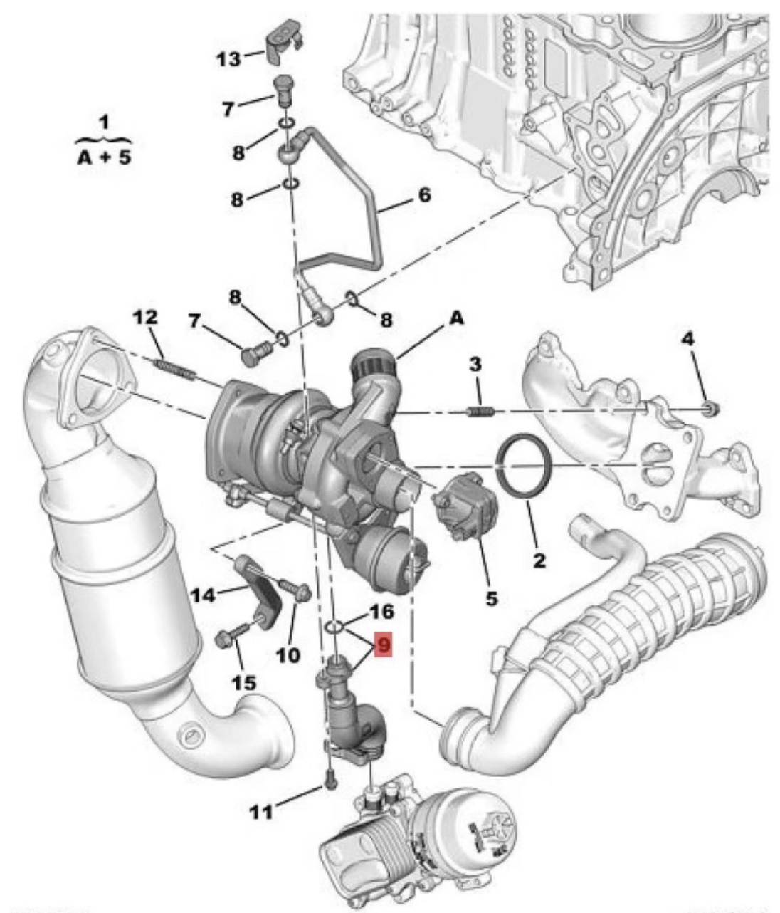 车上架子,1.6T空间超级小,根本不好判断是哪漏油。对比配件总装图,仔细看了半天,感觉是涡轮回油管连接涡轮的地方漏出来的。