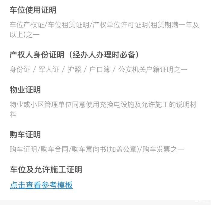 先和大家分享一下我申请电表的过程,首先在申请电表前要先准备好需要的材料,1、车位使用证明(车位产权证或者租赁证明) 2、产权人身份证明身份证或者户口本 3、物业证明(物业允许施工证明)4、购车证明(购车合同或者发票) 5、车位现场图