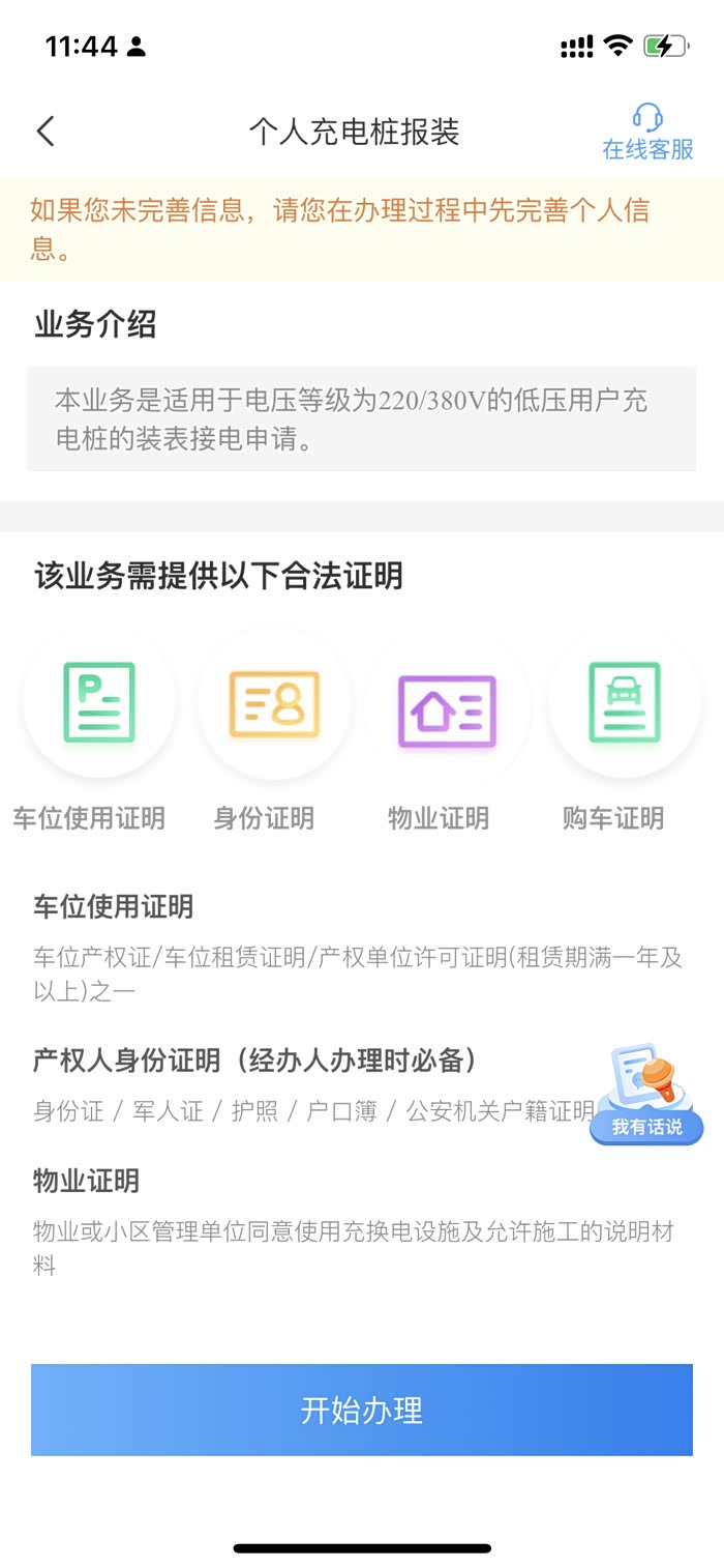 点开国网APP—点击电动车—充电桩报装—选择地区—点击开始办理并上传材料