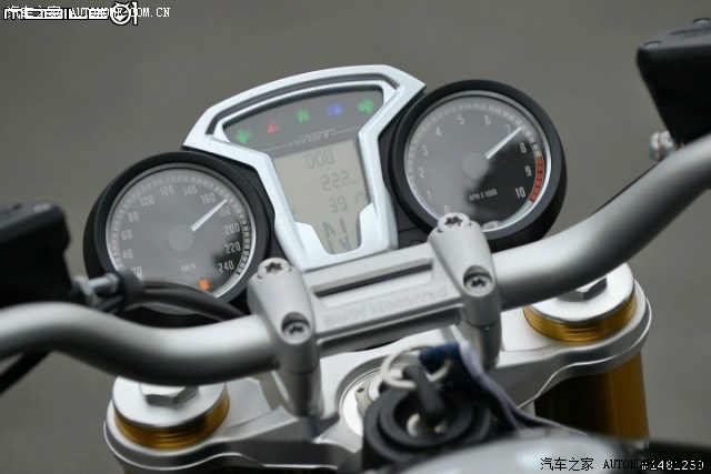左侧的时速表部分采用公里计算,而最高时速显示为240公里,面对过去在1923年时推出的R32曾经跑出279.5公里的成绩,我想融合了高科技的R nineT想要突破240公里的大关应该不是太大的困难处。在时速表中,同时还有电池灯号指示器与加油灯号指示器,提醒骑士在灯号与电瓶上的使用状况。