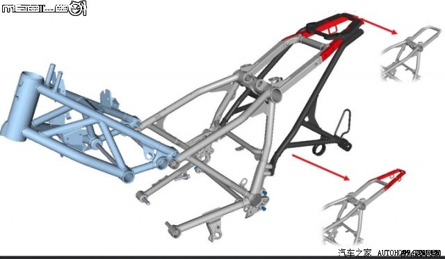 车架本体采用多段式的组合车架,最主要的原因在于R nineT在原厂设计上就是一辆百变金刚,不论是双载骑乘的街车外观、还是要走短车尾的手工车样式或者Cafe Racer的单座风格,可拆式的尾架设计,让车身分为多段联结而成。前方主车架部分为编织式的车架结构,提供车辆高度的刚性也兼具著复古的外形。中间灰色部分的车架主要用来连结悬吊系统与主车架跟尾车架的部分。而尾段车架则可以依照车主对于车辆外形的喜好进行拆装。红色支架部分为后座支架,拆装上也都相当便利,数颗螺丝就可以进行联结支架的拆装。