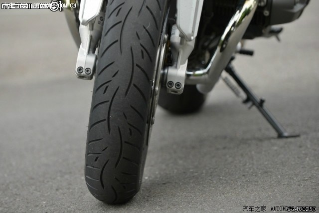 前轮规格为:120/70-ZR17,利用象牌轮胎特有的制胎技术,在中央层提供高张力的钢丝,减少在高速离心力下轮胎胎体的变形,避免轮胎变尖而减少了轮胎与地面的接触面积,达到提升抓地力的效果,而实际测试部分在稍后的试乘中会有更详细的说明。