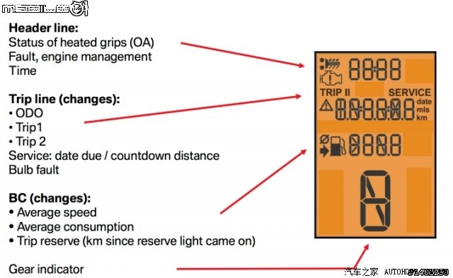 整合了多样功能的液晶仪表包含了原厂提供选配的加热把手、喷射电脑的监控系统、时间显示、总累计里程、单趟累计里程、公英里切换显示、日期、警示灯、平均时速、平均油耗以及档位显示的多项功能,虽然说仅仅是小小一块液晶萤幕,几乎将全车状态的显示都集中在这颗仪表上,对笔者来说其实稍稍过于复杂,丧失了简约的理念,不过毕竟关系著车辆行车安全与资讯,这样的设计也是无可厚非,取决于每个人在使用习惯上的差异。最常用的应该还是在档位显示以及总里程累计与平均油耗的资讯,与骑乘的者息息相关,也最容易注视到这几项功能的使用。