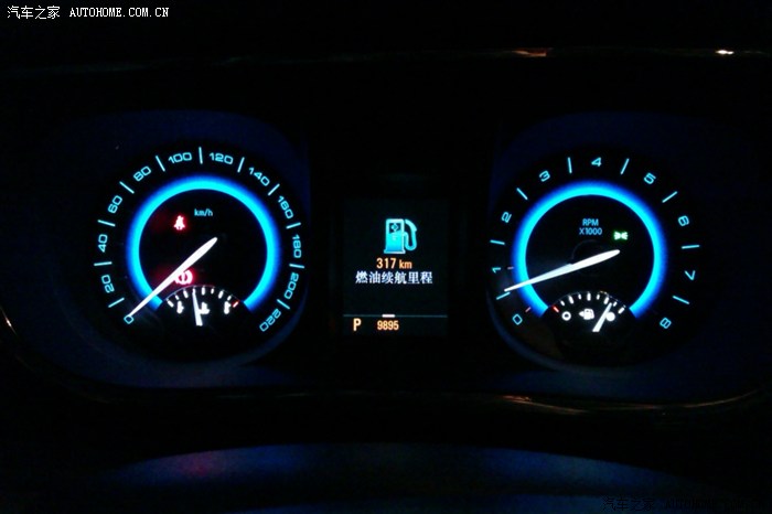 仪表盘夜景,中间是行车电脑,可以切换显示导航信息、续航里程、油耗信息等