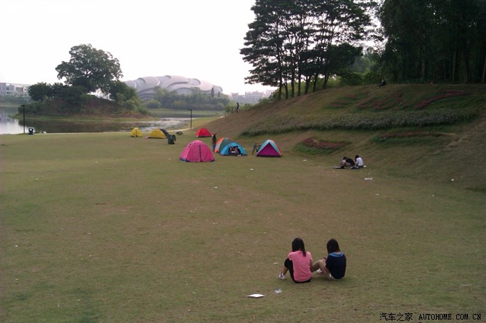 在中心湖露营的学生。远处的建筑物是大学城自行车馆,亚运赛场之一,我的宿舍楼就在自行车馆旁,呵呵,看着这个体育馆建起来的,他建成了我也就毕业了。