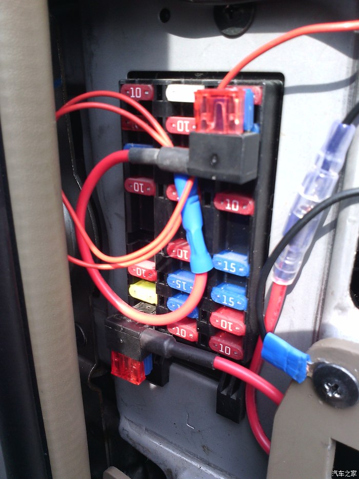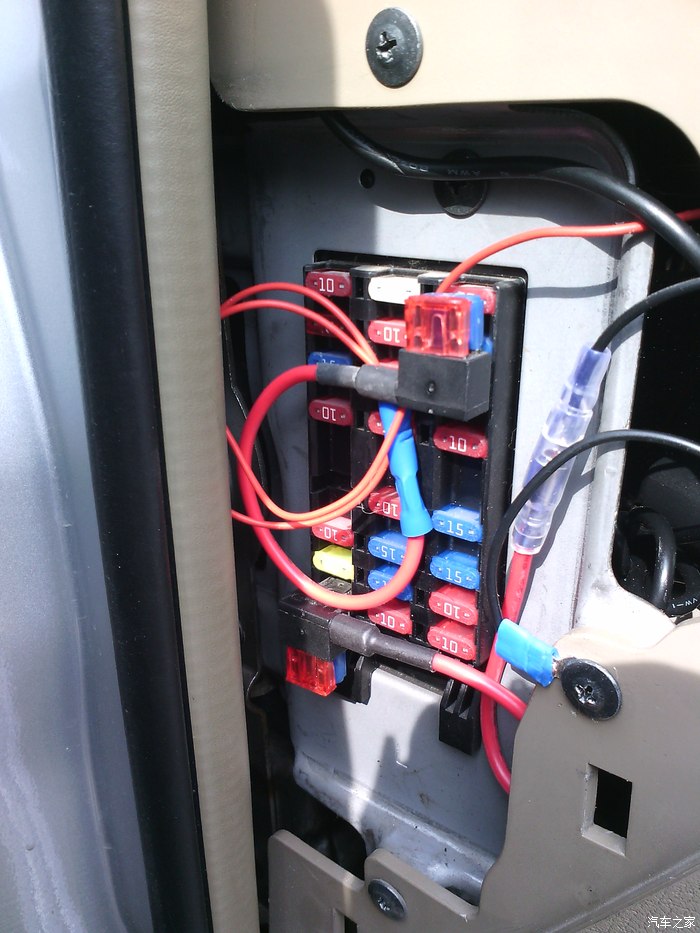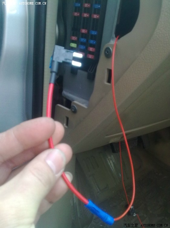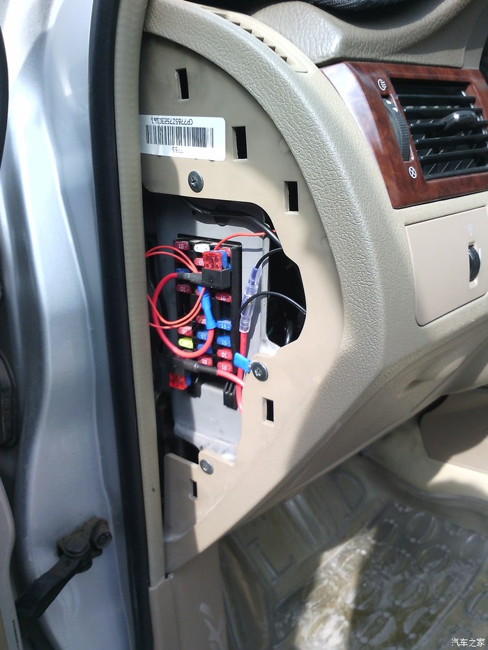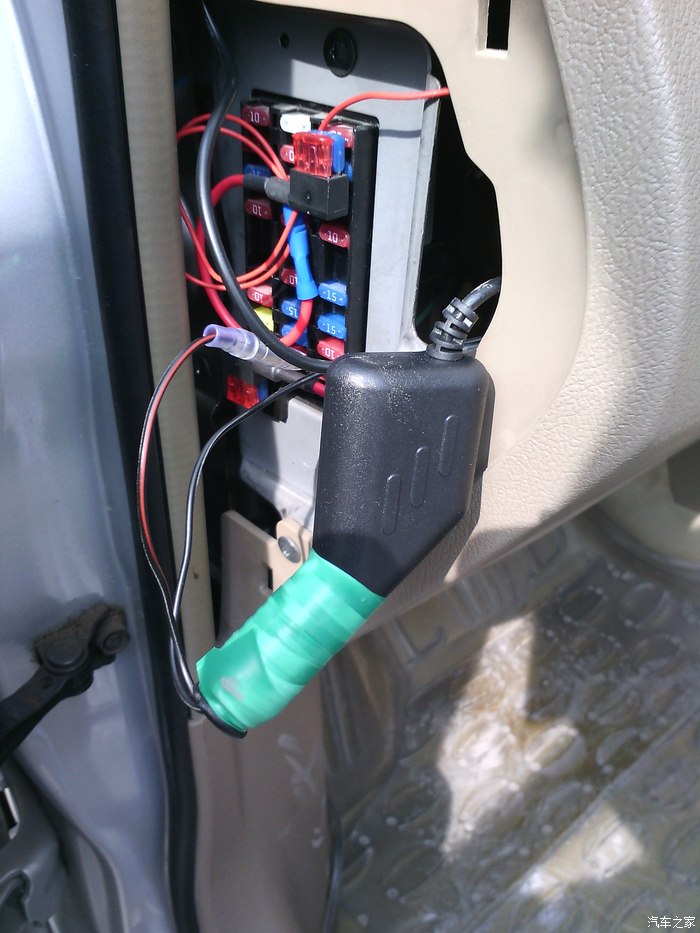 是不是看不出走线?窍门--机智的同学都知道,保险盒取电,自己改装电源线,物尽其用。一条取电点烟器,一条取电天窗,钥匙拨到第一档就通电。