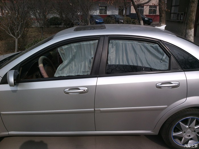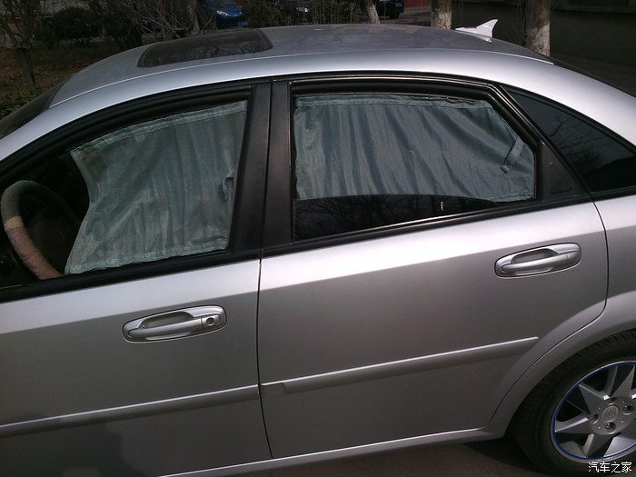 继续车身外观的,初夏时因为隔热膜时间太长了(7年),颜色变得很浅,开车时很晒所以自己安装了一套窗帘。