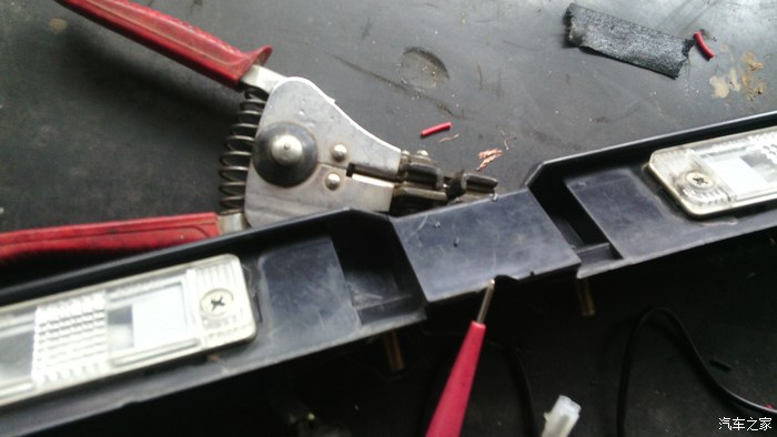 然后安装牌照灯组件,将摄像头引线从锁孔拉入,线放在用钳子搬的槽子内,小心将锁子安上,上固定罗丝要轻轻操作,慢慢上紧,不要伤着摄像头的线。