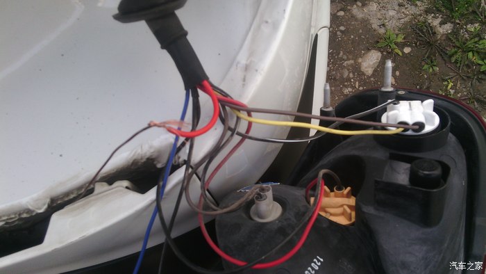 在乐驰说明书上没找到倒车灯的相关线路位置,决定在倒车灯上取电源。