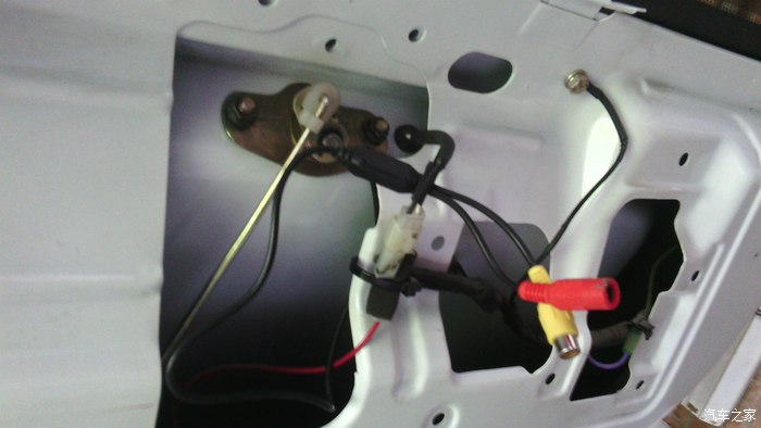 之后用电源的那根线把显示器的线从仓门左上角的孔子里带到摄像头处,在后门锁接地处给可视系统取电源负极(并的那根黄线)。