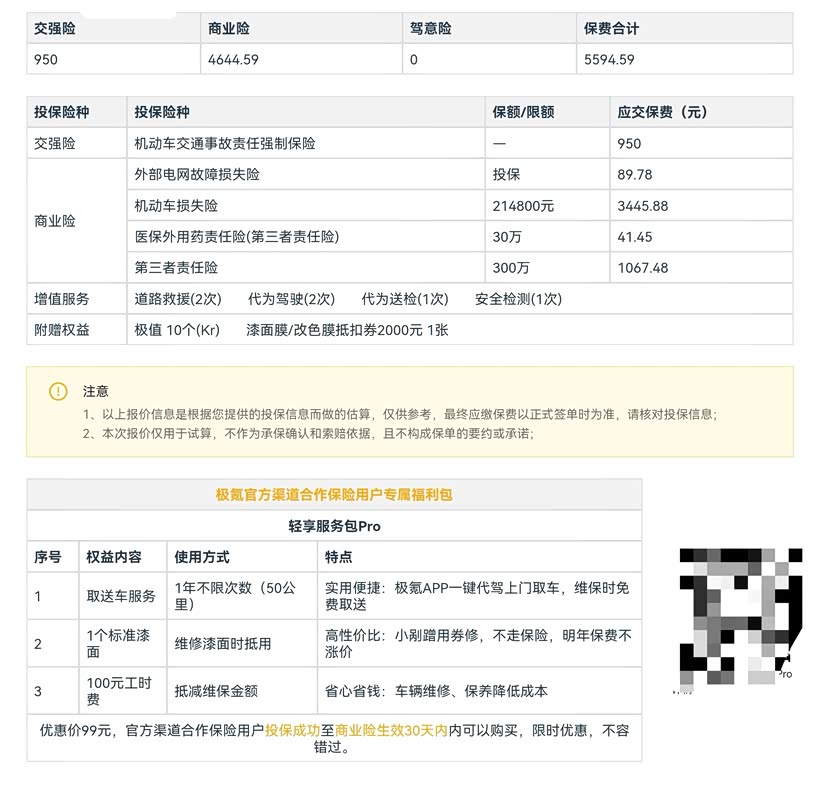 保险:店保5594.59。极氪店保可以说很良心了,合作三家,可比价可调整保额。最后买的平安。