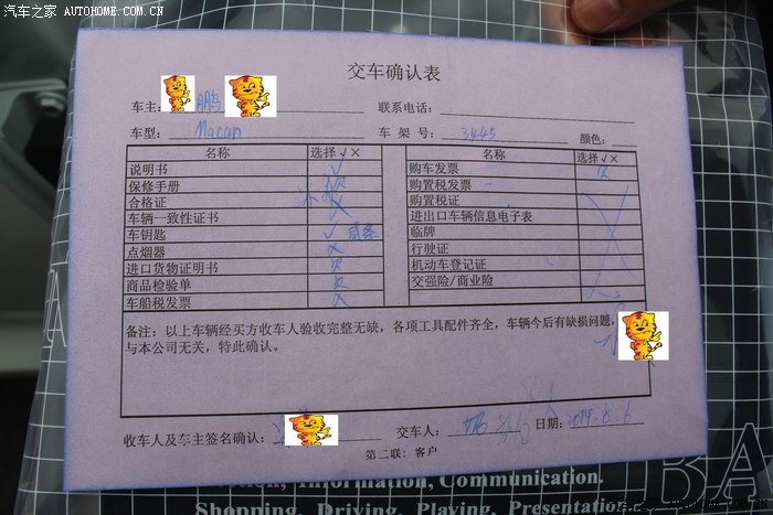 2014年8月6号怀着激动的心情,我的爱虎( “Macan”一词是印度尼西亚语里老虎的意思)终于提回来了。我之所以会选购Macan不只是因为Macan外观动感时尚、动力强劲、加速性能优越,还因为Macan有老虎这意思。我的小名就叫虎仔,车友们也可以叫我虎仔。