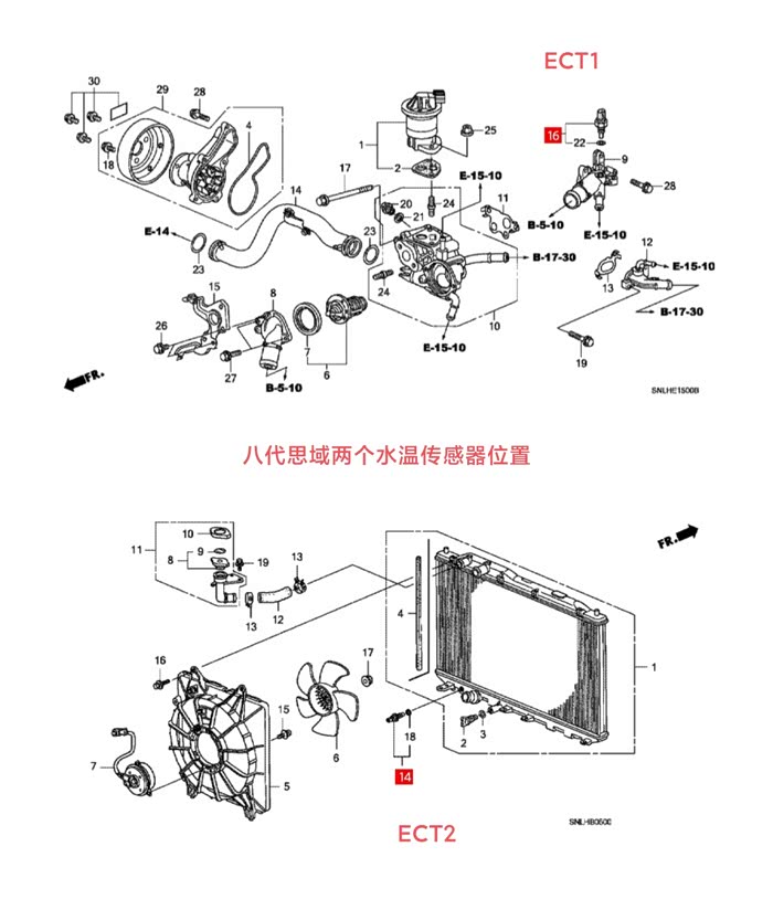 本田思域八代的两个水温传感器位置如下: