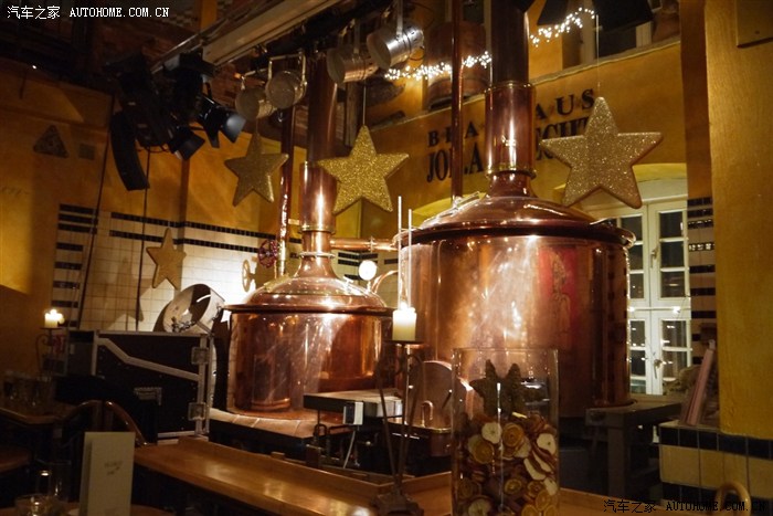 晚饭的餐厅一进门就看见酿啤酒的大罐子,客人们喝的都是从这里直接打出来的新鲜啤酒,麦香味十足