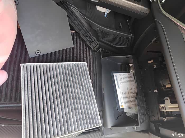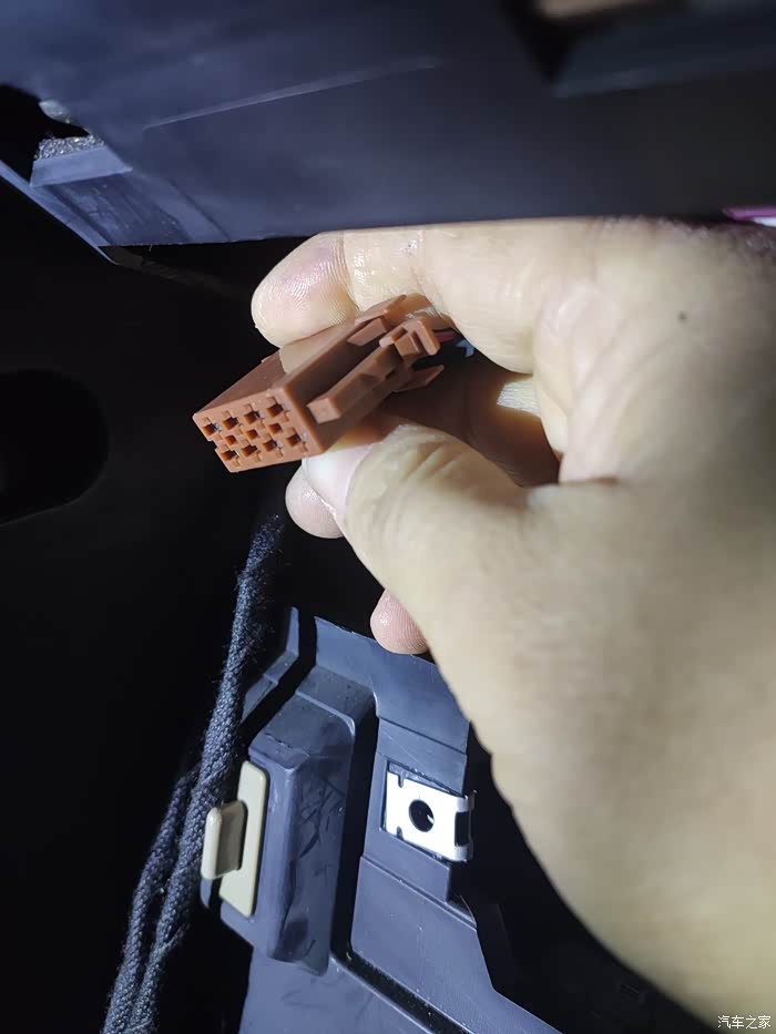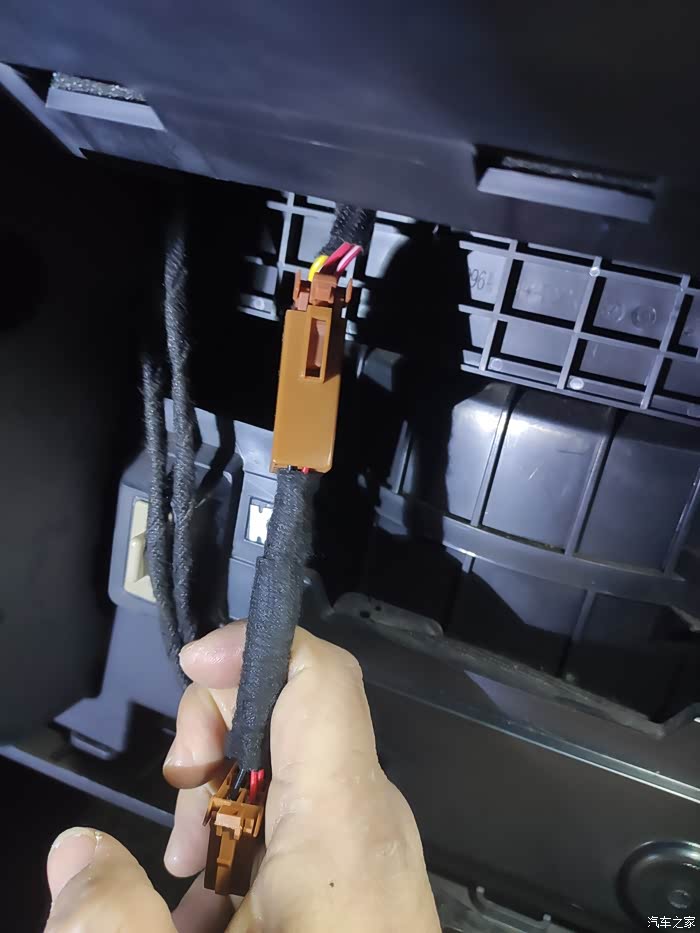 a.拆卸手套箱(副驾驶杂物箱)。面对手套箱,拆掉手套箱最右侧阻尼杆的连接,逆时针旋开手套箱内部两个挡纽(这个挡纽如果第一次搞很紧,太暴力用钳子旋开会搞坏塑料凸起,可以尝试边拔边旋),拔掉手套箱下部两个类似插销的物件(自制工具,好施工),这样手套箱就下来了。