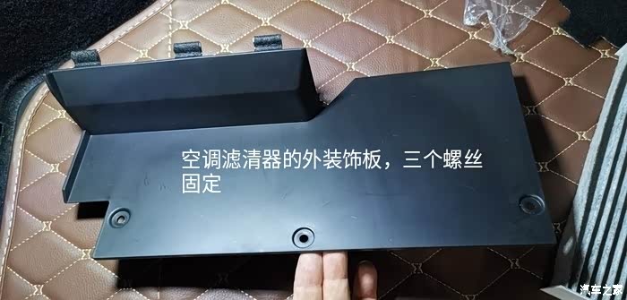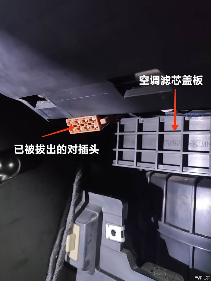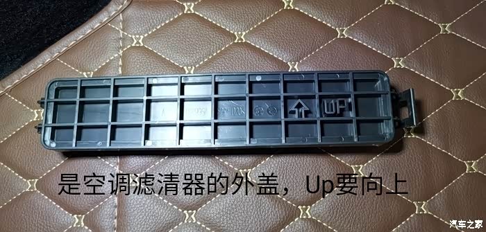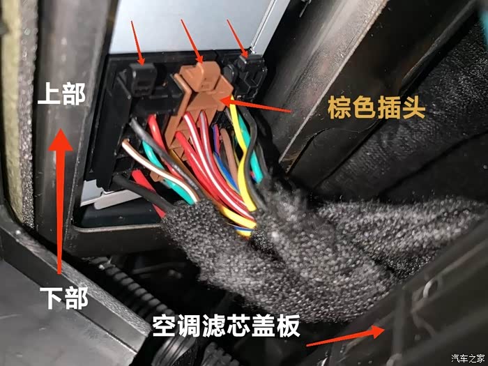 c.插拔件的位置。上面完成后,就能发现每次更换空调滤的盖板,图中有标识。在它的上部,能发现三个长方体的插头,两侧是黑颜色,中间棕色那款就是这次插拔件。