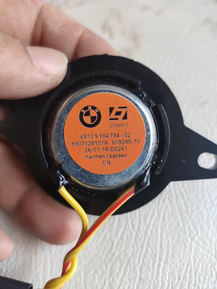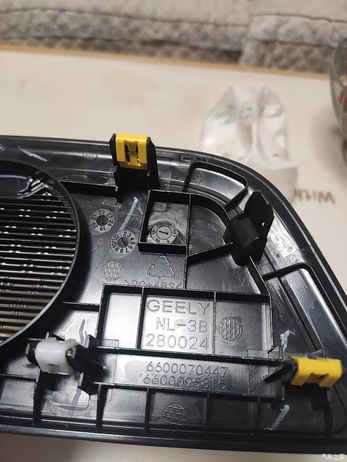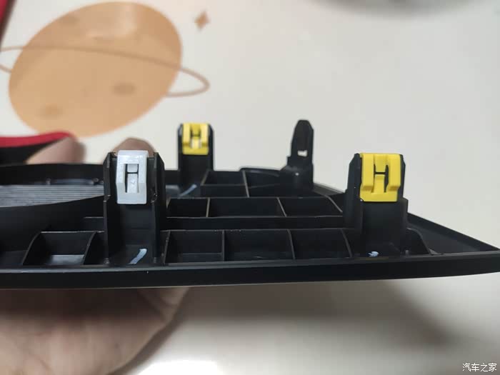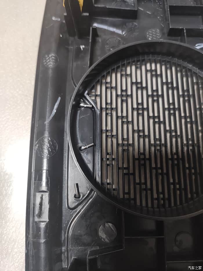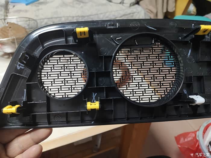 d.拆卸喇叭的盖板。盖板本身是有孔的,省下更换的费用。盖板没有螺丝,两侧两个定位销和若干黄色卡扣,下面有图显示,看清卡扣的位置,胆大心细的撬开就行。(技巧,不要在一个地方使劲翘开大角度,应该分散翘,防止某个卡扣受力集中断掉)