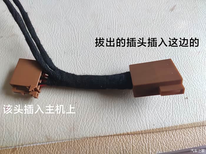 f.插头对接。拔出棕色插头,通过研究购买的配套插头,只需按住外侧显露的小按钮,边轻微晃动边拔就可以。图片有展示。主机,喇叭侧分别对插好就可以。