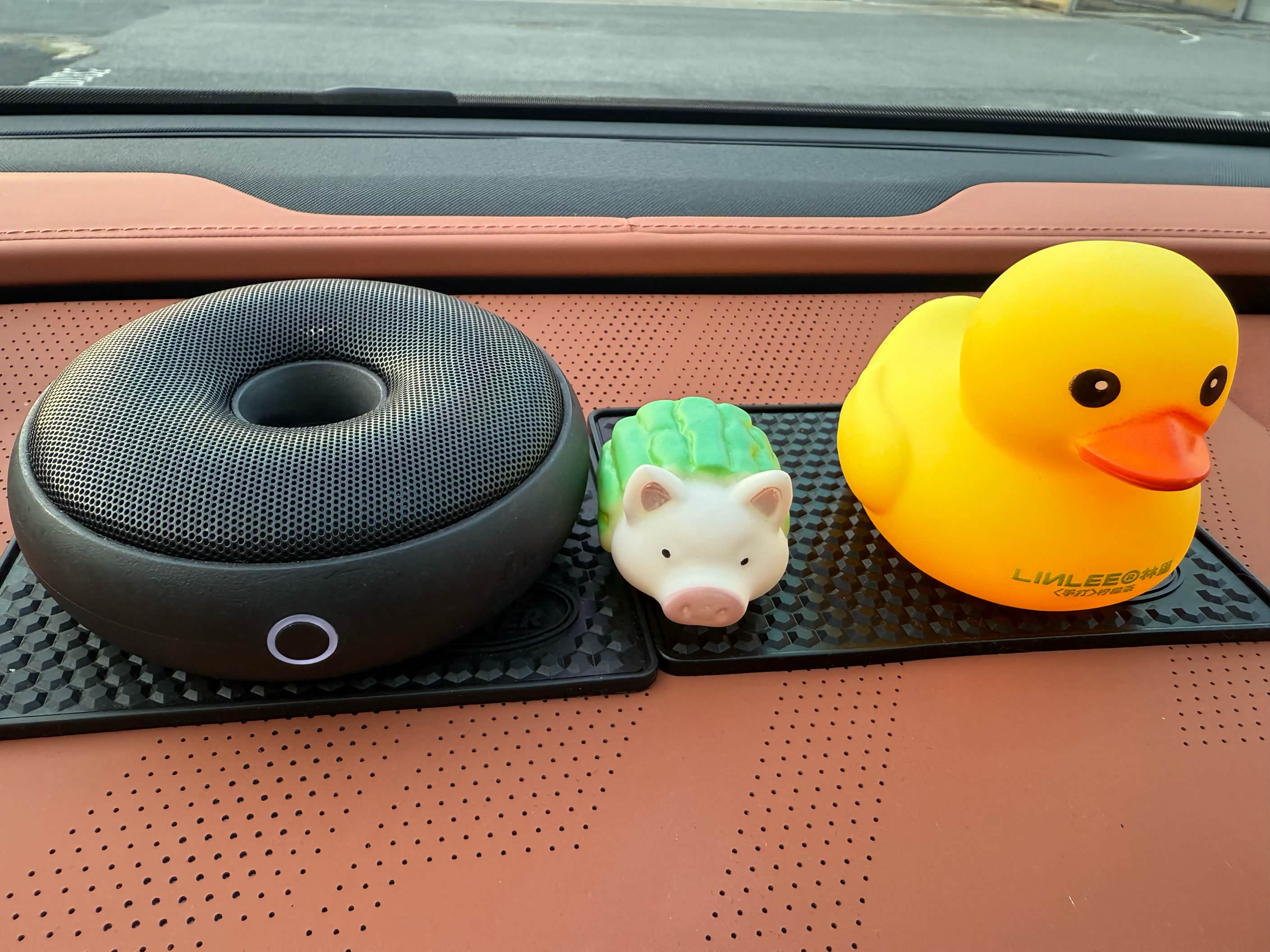 中控屏后面有着空旷的位置,当然不要浪费,防滑垫上是中号黄鸭+小粉猪+空气净化器组合,仪表屏还隐藏着一只小黑猪,看到吗?