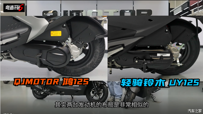 发动机方面两款车型,两款车型都使用了一台单缸被动风冷双气门发动机,实际最大输出功率均为6.9kW/7000RPM,从发动机外形观测,两款发动机的CVT变速箱长度或者后尾牙箱体外形基本保持一致。在一开始牛仔也以为两款发动机是一样的,但通过网上参数查找之后发现,他们的缸径行程会略有不同,QJMOTOR鸿125实际排量为124.3cc,缸径行程与本田的NS125发动机相似。而铃木UY125的实际排量为124cc,与豪爵的ESS125发动机相似。