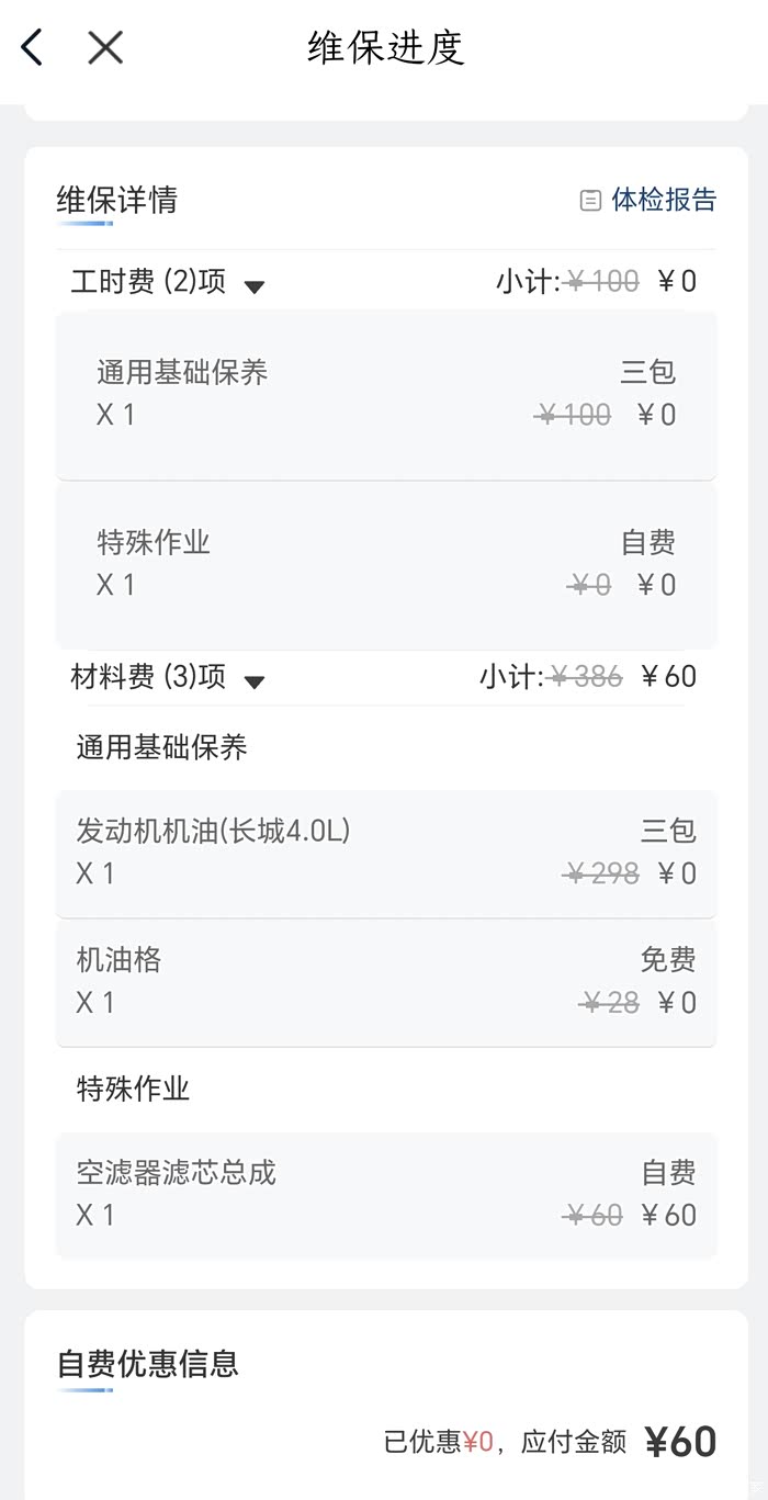 因为楼主是终身保养(包含机油,机滤,减速齿轮油及工时),所以此次只花了60元