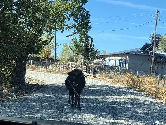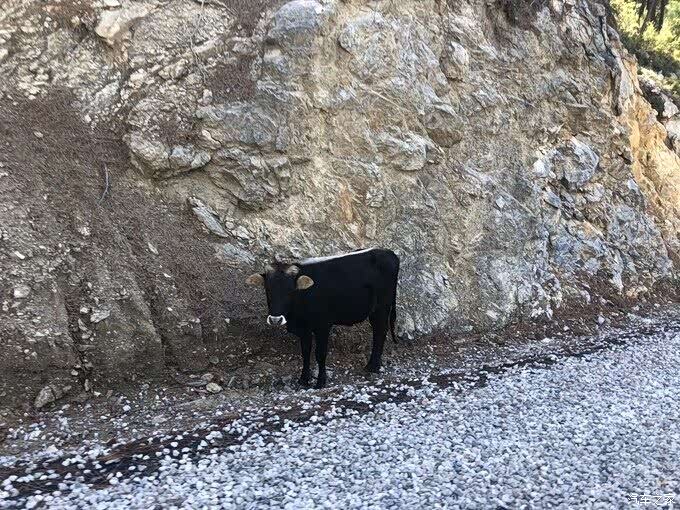 但是当我们越往上走路况越来越差,都是石子小路,非常难开,而且我们不能回头走。吓得我都不敢充电,怕汽车没油了。睿哥说我紧张得都是手扣住车门的。也算是经历了,一路上还有牛哞哞。