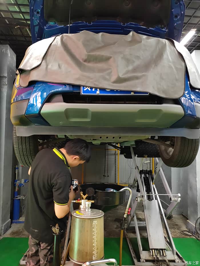 这是师傅已经是在更换机滤的时候了,车友们注意了,这个机滤最好要求用扭矩扳手装,不然之后再保养时就不好处理了