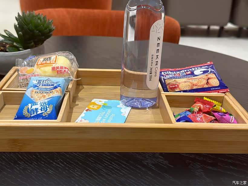 极氪的服务与细节时常带来惊喜。这套精致的茶歇托盘,是门店提供的贴心服务之一。专属的ZEKR Care饮用水、小点心,不仅缓解了等待时的无聊,更体现了一种有温度的关怀。这种超越车辆本身的服务体验,让人感觉自己是真正的“用户”而非“客户”。