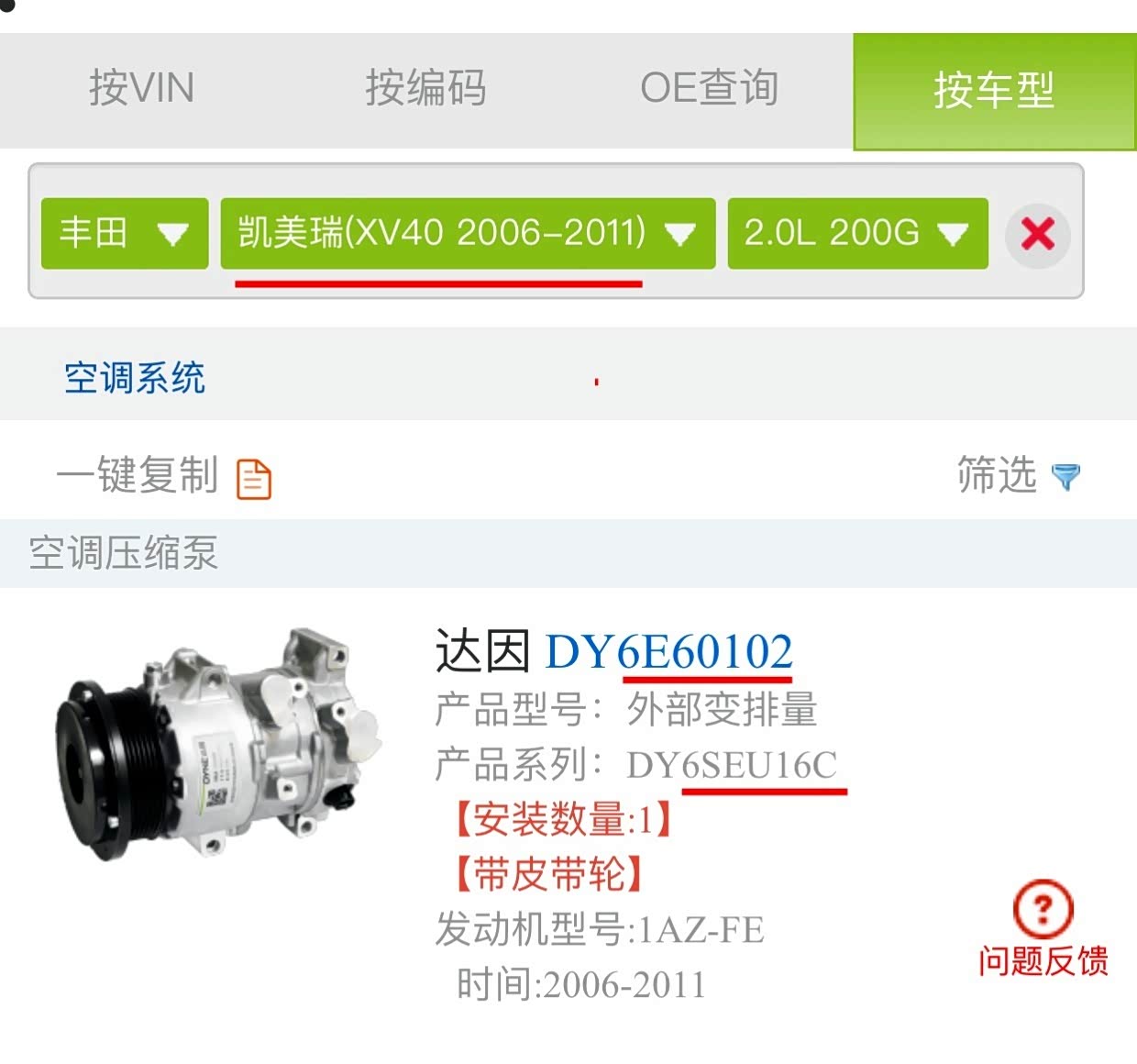 按车型查找六代凯美瑞,与原厂电装一样的6SEU16C,达因有自己的产品型号。