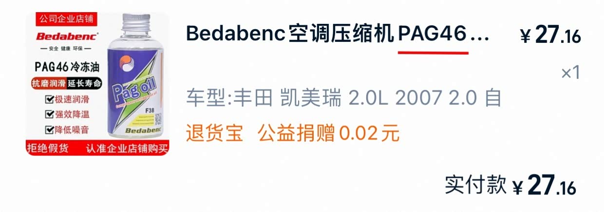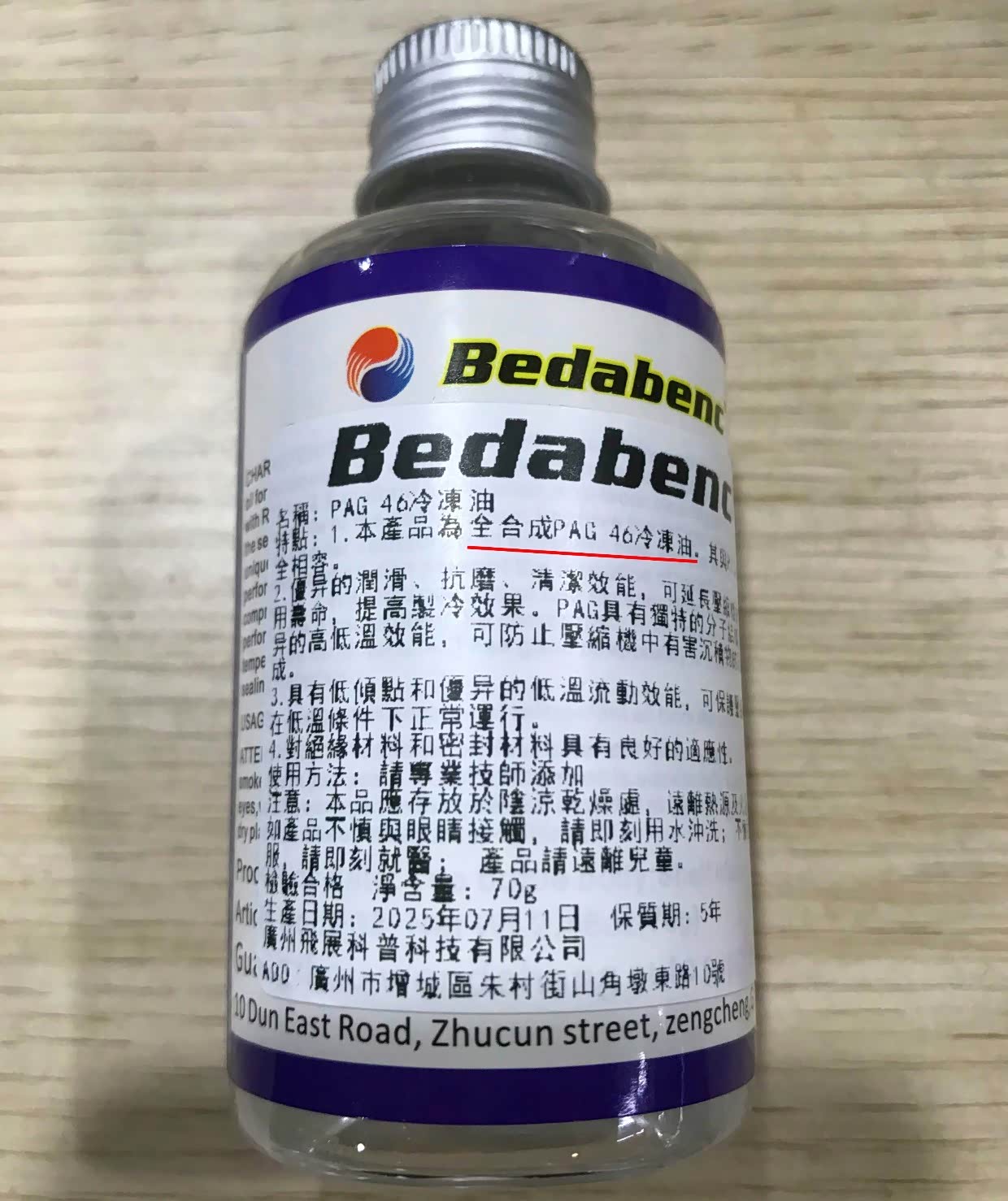 PAG 46的冷冻油属于超低粘度的油品,粘度等同于0W20的机油。