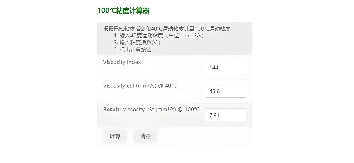 已知40度的粘度为45.6 cSt,粘度指数144,计算得到100度的粘度为7.91 cSt。