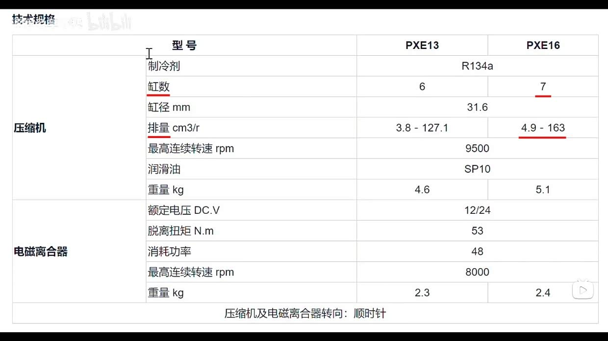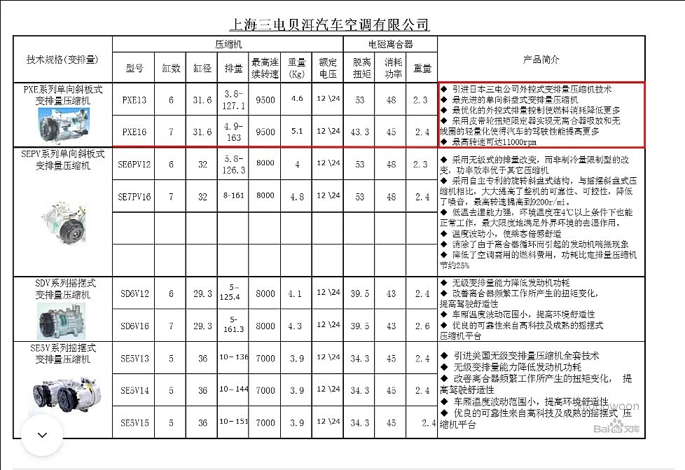 不同点在于PXE16有7个气缸(原厂电装是6个气缸),理论上缸数越多,做功能力越强(制冷量大),但缸数多摩擦损耗也大(对动力的影响)。