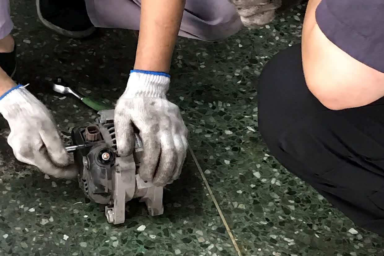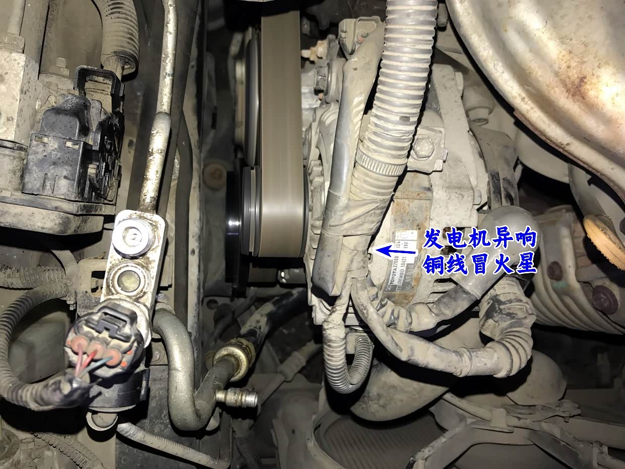 令人意想不到的事情发生了,启动后发电机出现异响,短短五秒钟发电机铜线冒火星,赶紧关发动机熄火。