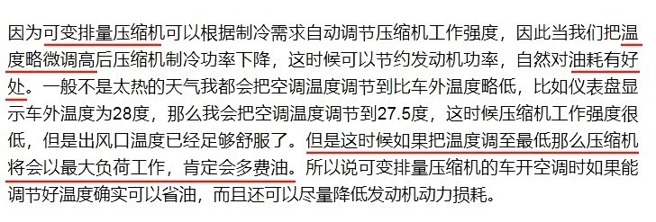 当车内温度下降以后,就不需要压缩机大功率制冷了,可以把温度略微调高,温度调高后压缩机制冷功率降低,就减少了发动机的功耗,自然就更省油。